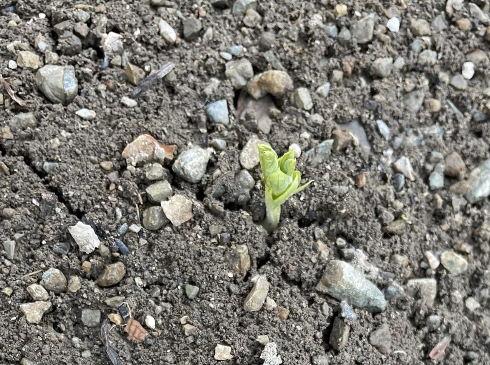 今日の発見は、エンドウ豆の新芽が発芽していたことを見つけた
