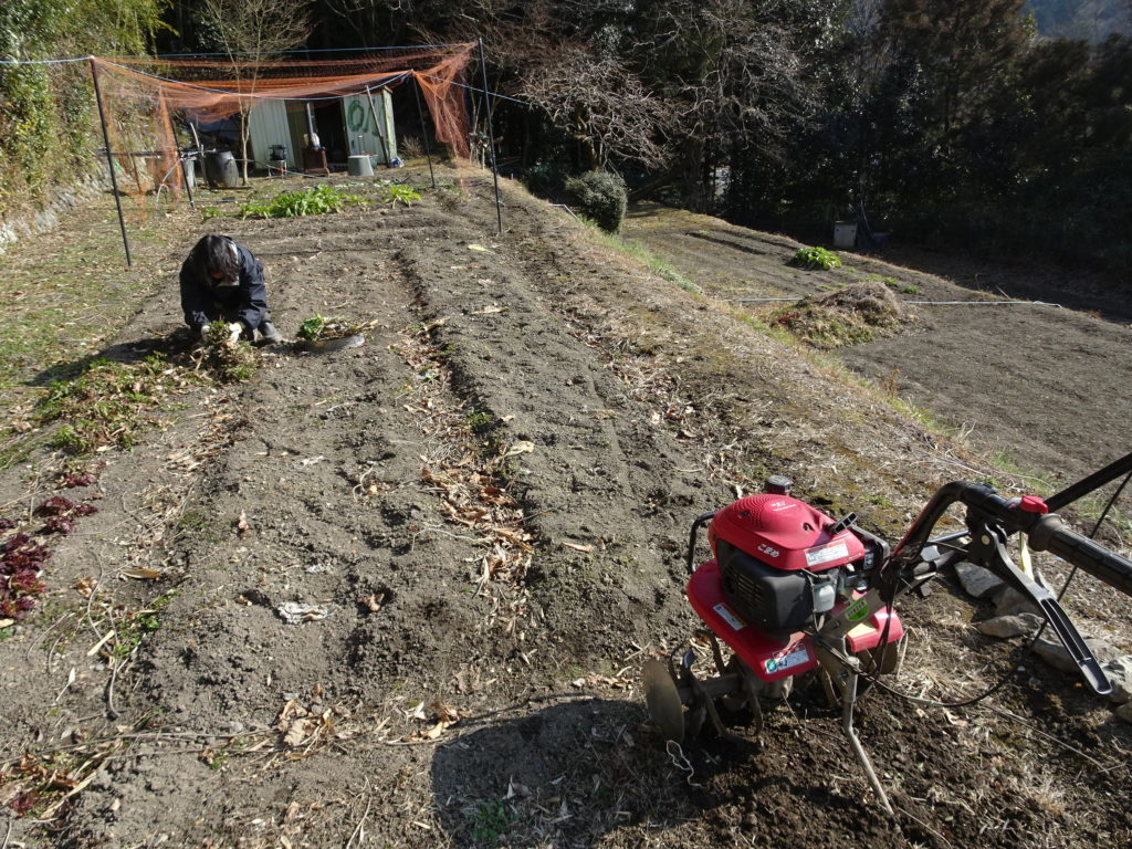 お昼から畑に、土お越し畑の倉庫の中からホンダの小まめちゃんを取り出し、土起こし耕運機のエンジンのひもを引っ張ると一発でスターターがかかり、少し鈍い音だったが、チョークを引っ張っていたので無事始動!