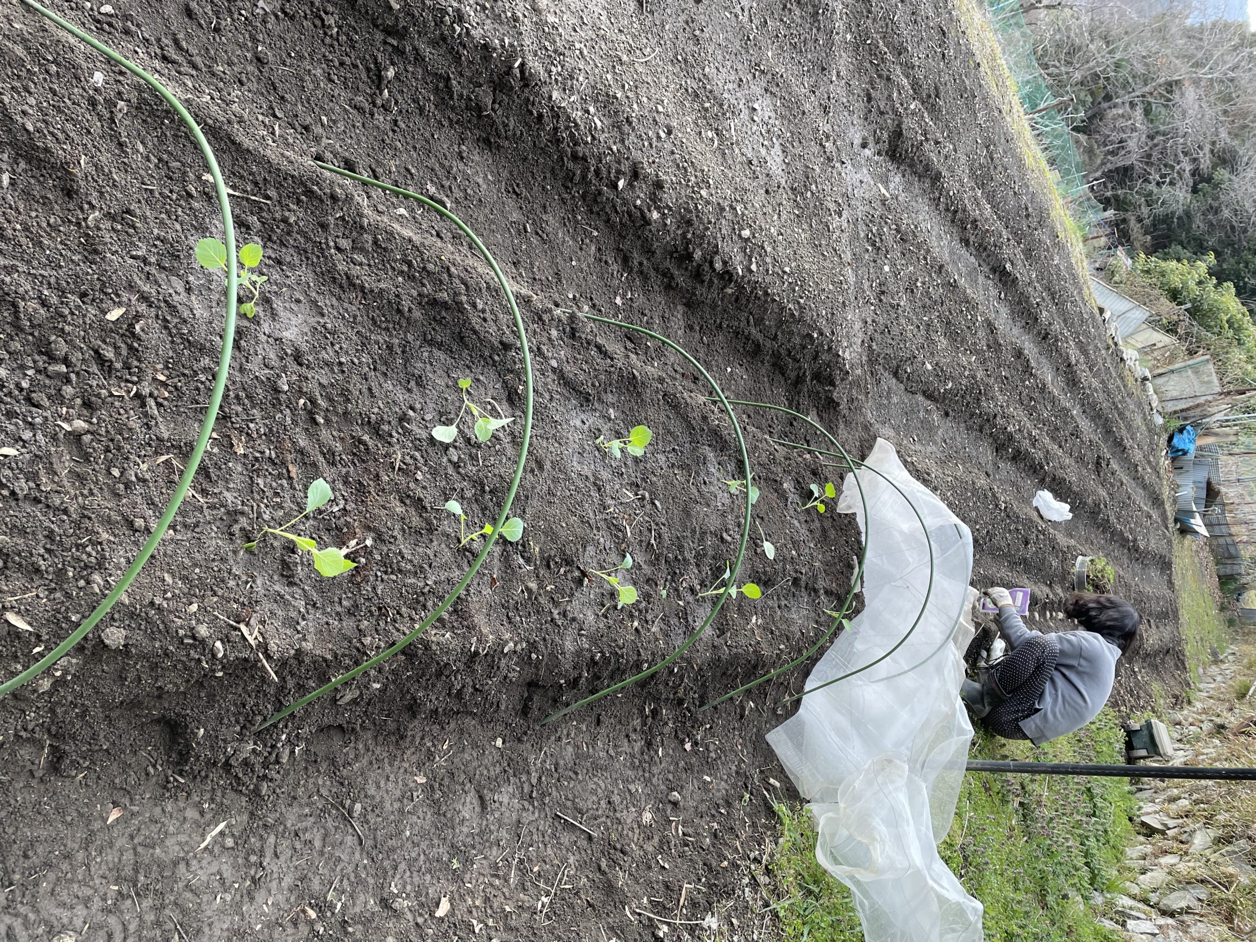 葉を育てるので畝をあまり高く上げてません、そして、苗との間隔を取り大きく育つように、キャベツの大きさを想像して 12個の苗を植えました。キャベツの葉は、これからの虫の大好物です。寒冷紗を掛け虫よけをして完成です。