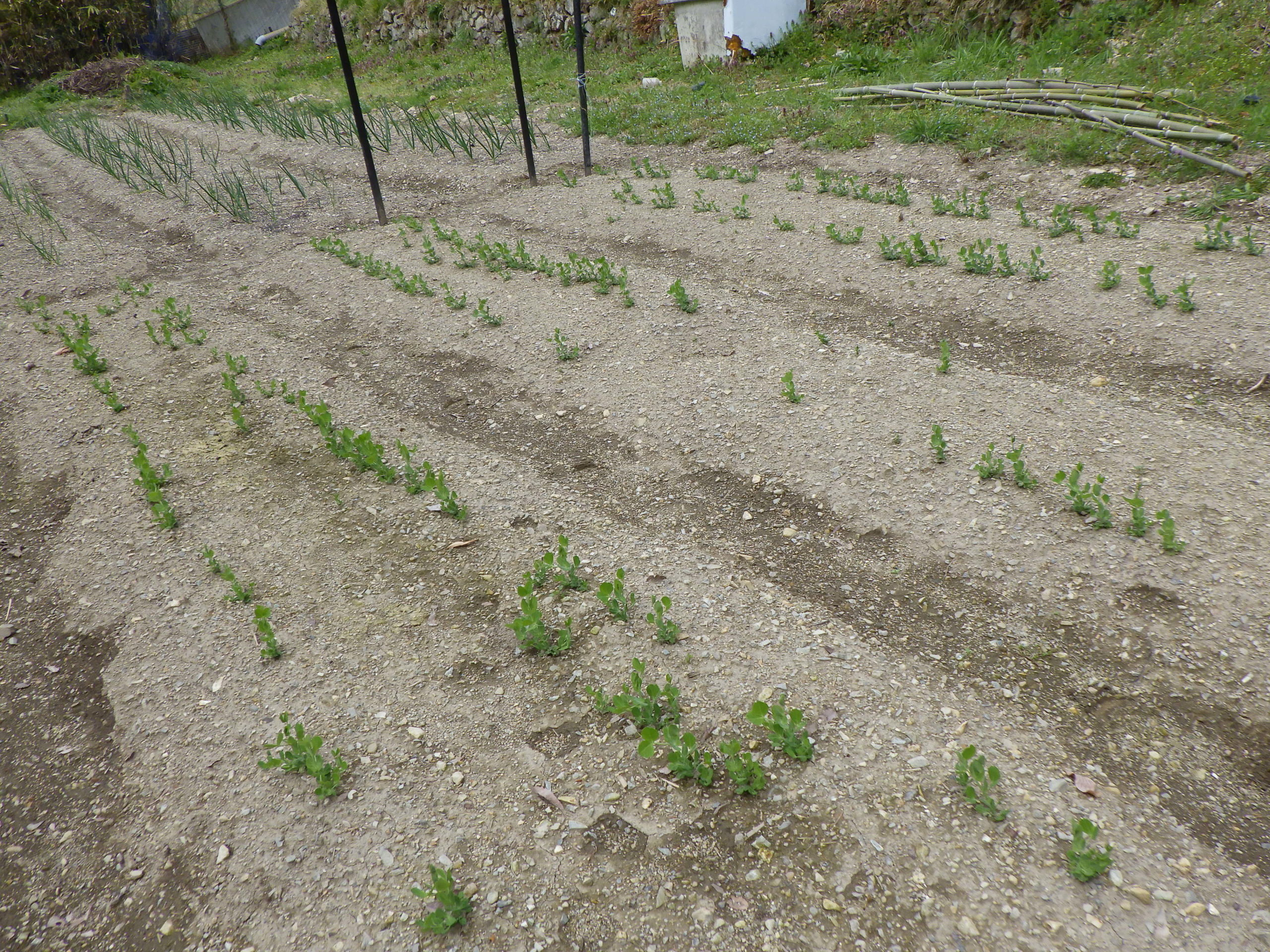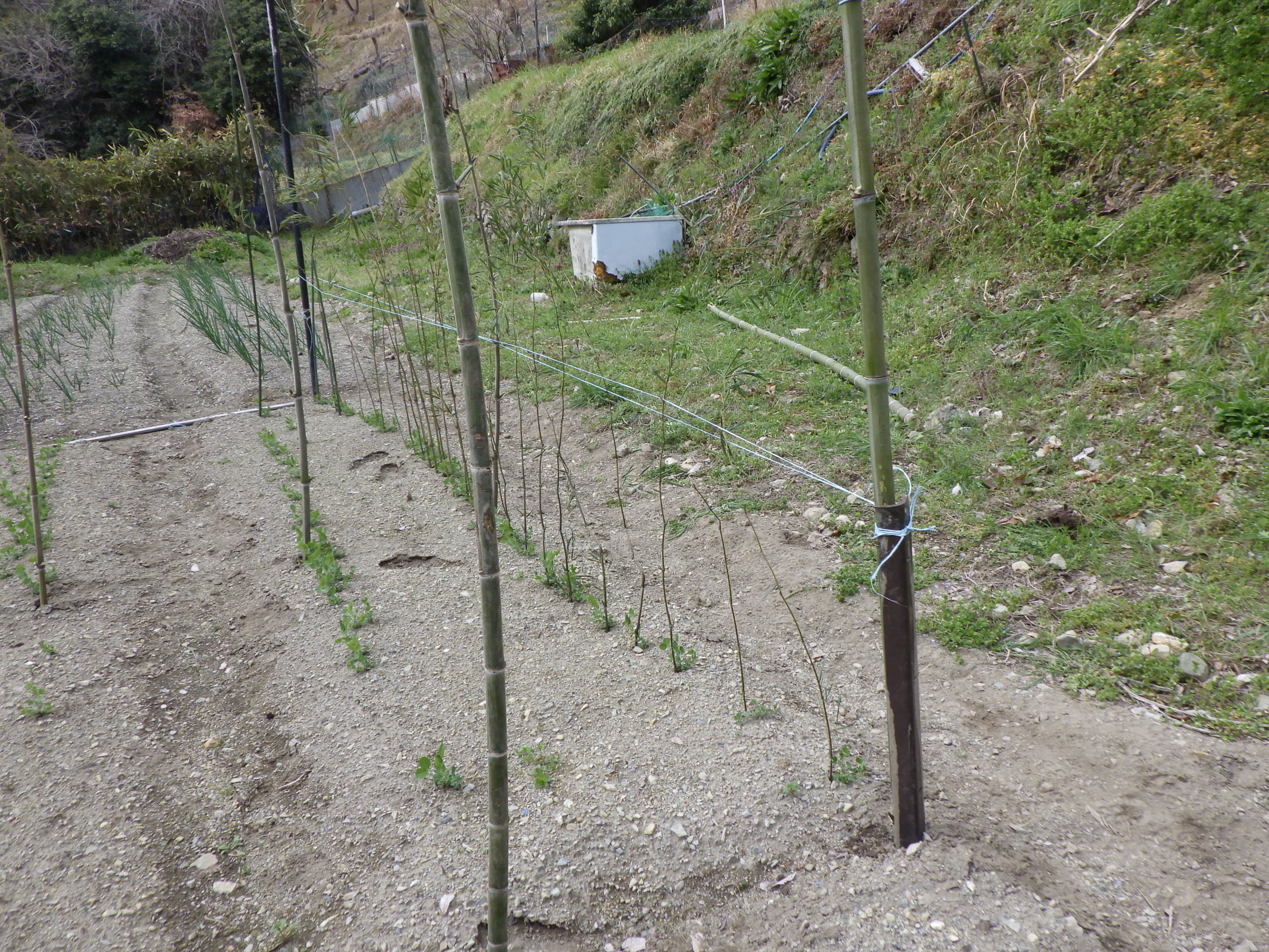 竹を2m弱にして、小枝をさばいて豆の新芽に支え棒とし埋め込んだ。