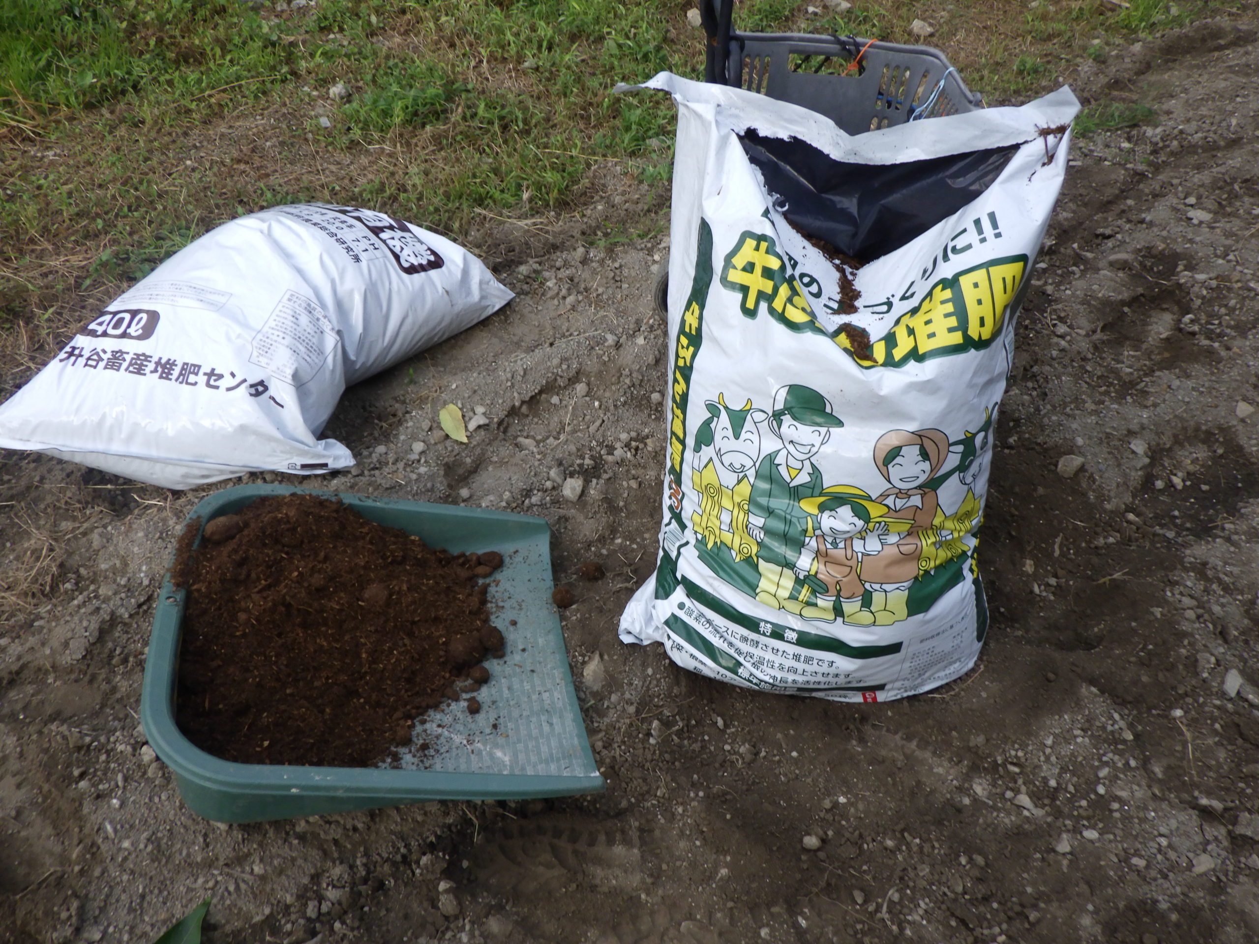 土の混ぜ作業、そして苦土石灰を投入し、牛糞たい肥を