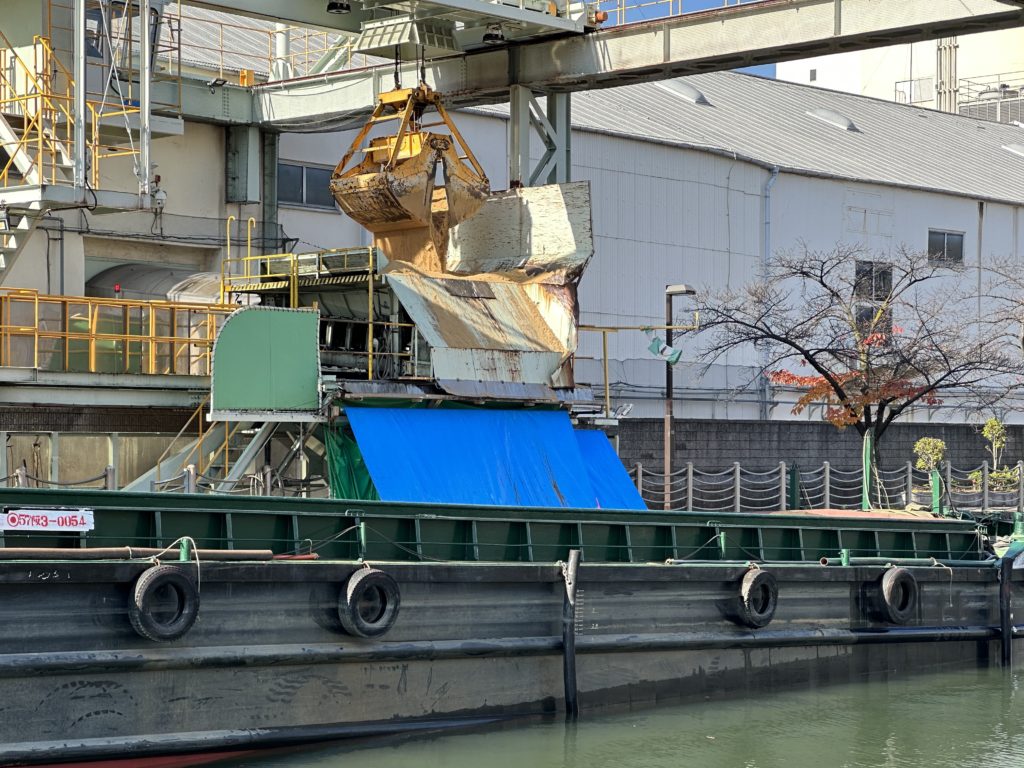 作業船が数隻停泊していて、船が工場へ工場で作られる原材料が