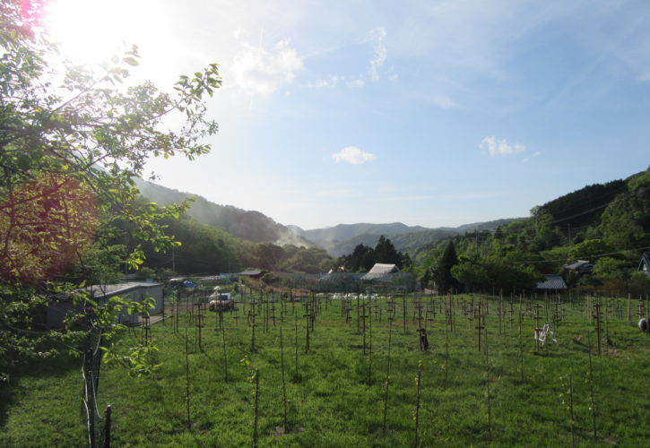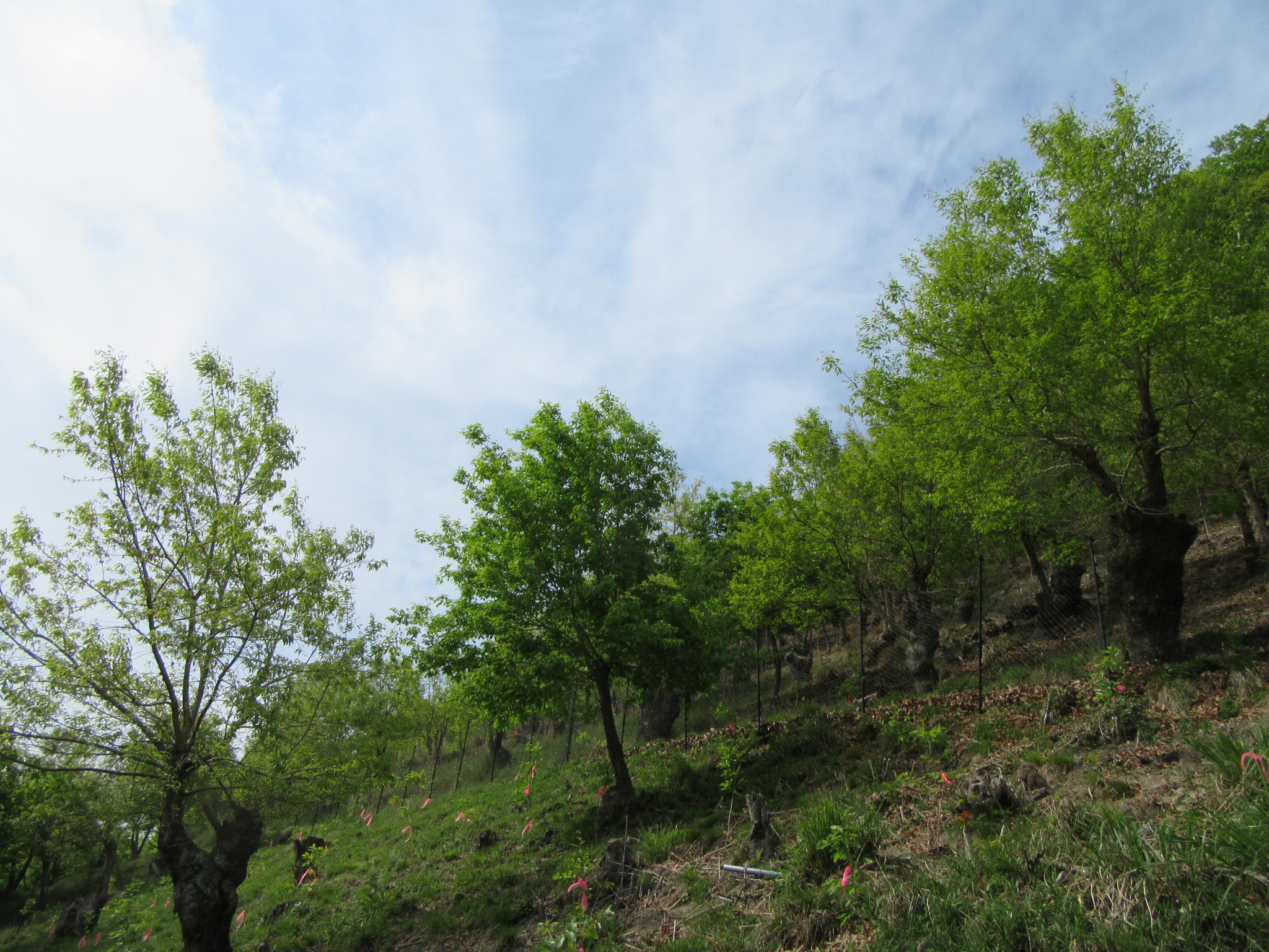 豊能の妙見山のふもとは、昔ながらの景色が望めます。今日は、お昼から天気が回復し畑を一休みしてだんだん菜園の里山周辺を散策、すっかり山が新緑に包まれていました。クヌギ畑の台場からの萌芽も伸びくぬぎが緑の葉の扇をつくつていました。
