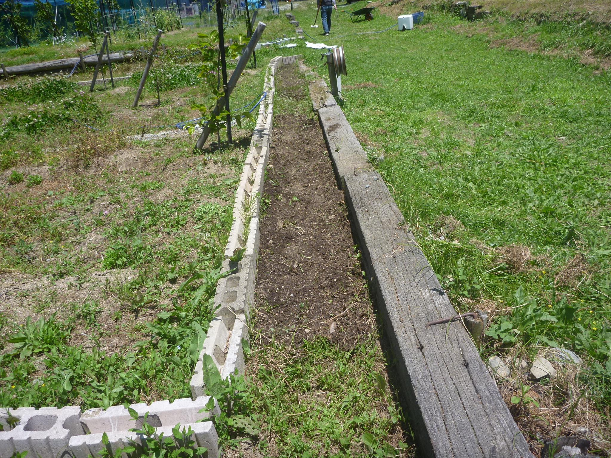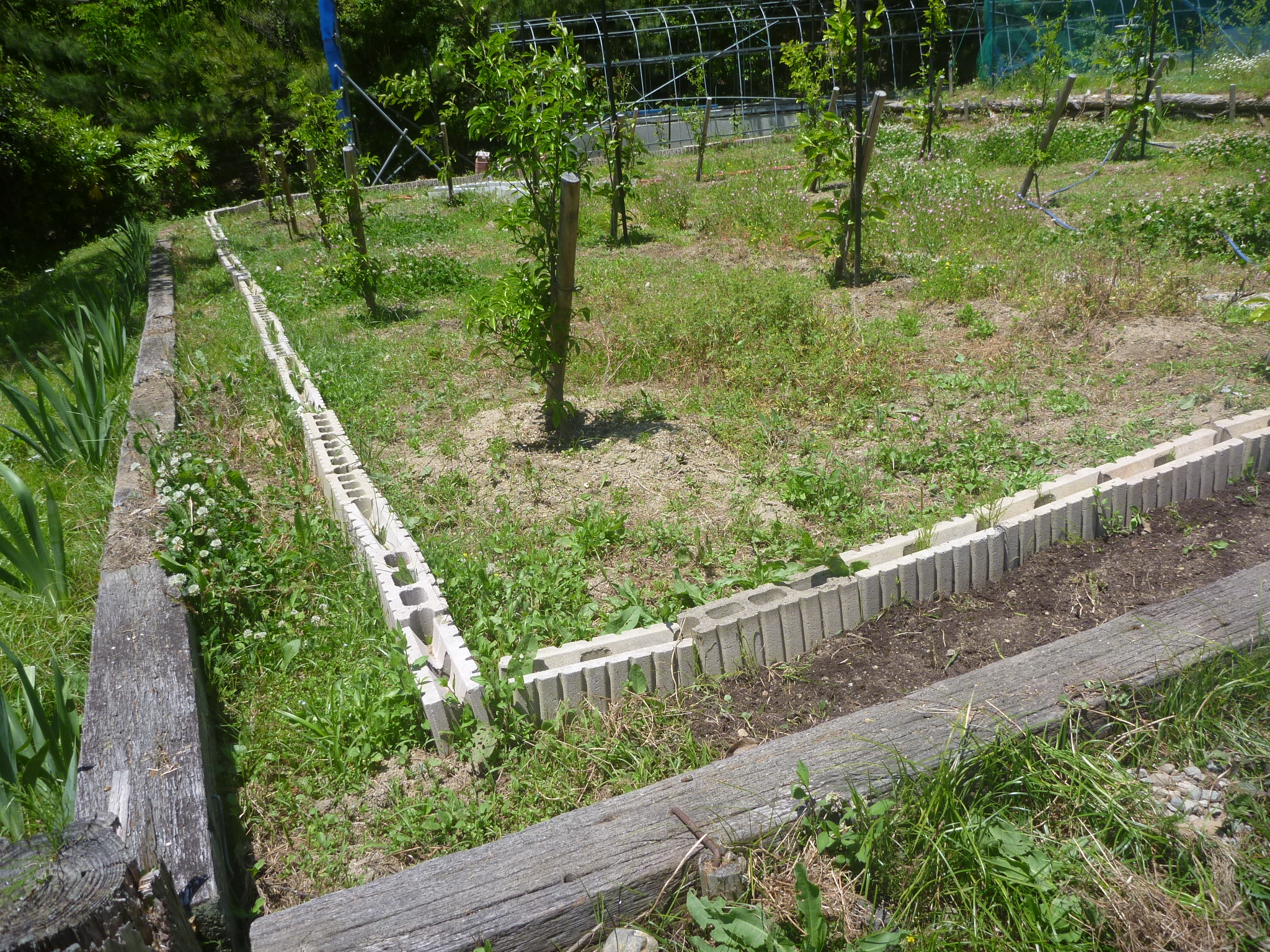 果樹園の周りに、模様のブロックを寄付頂き設置しました。70cmぐらいの幅でその中に、野草やハーブを植えようと思ってます。管理小屋の園芸コーナーから種が飛びあちこちに、ハーブの種類の「オルレア」が白い花をつけ咲いていますこの花をまとめて果樹園の4コーナーあるうちの狭い方のコーナーに集めて苗植えしょうと今日は、腐葉土を入れ整備をしています。「オルレア」は60cmぐらいの高さですのでまとめて植えるととても奇麗にまとまると思います。