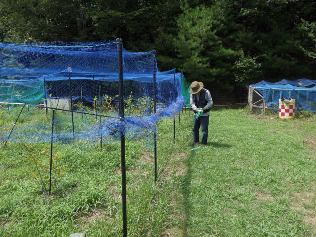 ブルーベリーの木を植え一年半ですが、なんrとかこの暑さも乗り越えそうだ、今年は、初めて実をつけ8月の初旬で収穫も少しですが、皆の口に入る程度になりました。今日は、もう鳥の侵入もないと思うのでネットを地面から少し上げ風が通過しやすくし台風から守るようにします。ネットを撤去してしまうとまともに、枝に風が吹きつけるので少しでもネットが緩衝材になるようにしました。高台なので強風が吹きます近畿直撃の予測もあり心配してます!