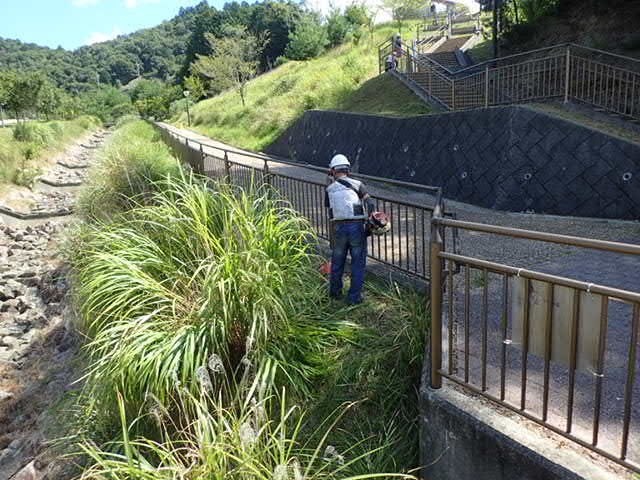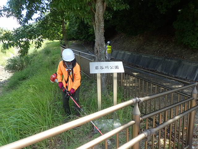 空は、青さが際立つ秋の空になってきましたが、お昼に近ずくと太陽の暑さは、まだまだ夏で気温は、30度越えまだまだ熱中症が心配です。今日は、Npoの活動日で、皆で、里山周辺の除草活動をしました。しかしお昼からの暑さで「熱中症を警戒し午前中の活動」にしました。今年は、里山の緑地部分は、いつもより雑草の高さも高く生い茂っているところが目立ちます。法面・岩谷川沿いなど緑地から歩道に掛かってきています。刈払い機を使い雑草を刈り取り清掃活動をしました。