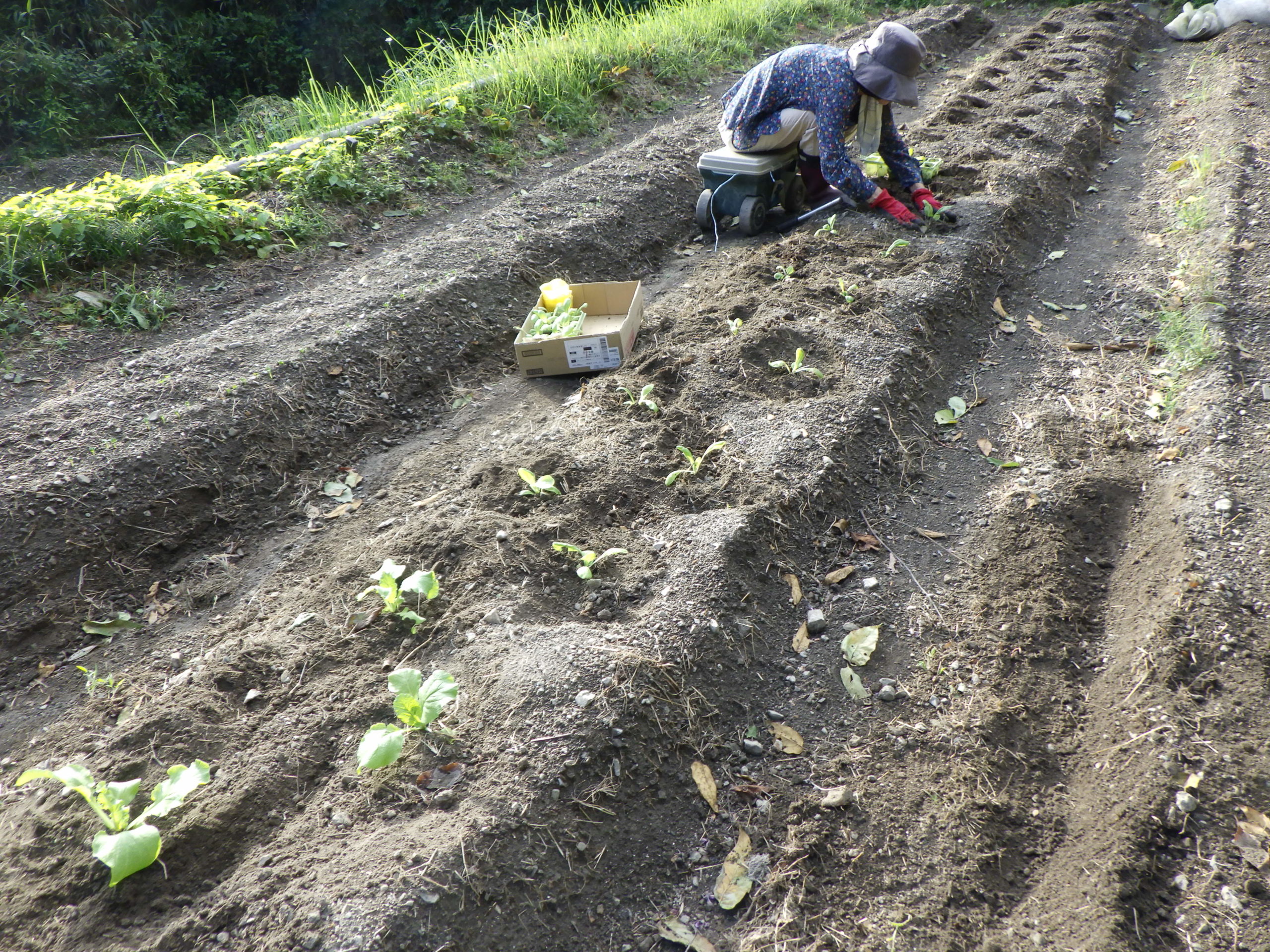 今朝の気温が、22度、やっと秋の訪れです。暑さ寒さも彼岸までとは、ほんとなんですね、お日様の直射はまだまだ暑いですが、吹く風はひんやりして、暑かった夏も過ぎたような気配です。豊能の「だんだん菜園」もようやく冬野菜をいつもより遅く、種が夏の温度で土になじまなく発芽が危ぶまれたので、今年は苗をホームセンターで買いました。「白菜の苗・キャベツの苗を」植えようやく冬野菜のスタートです。