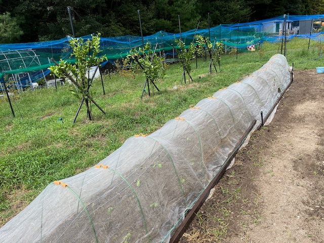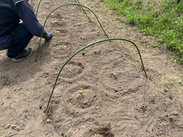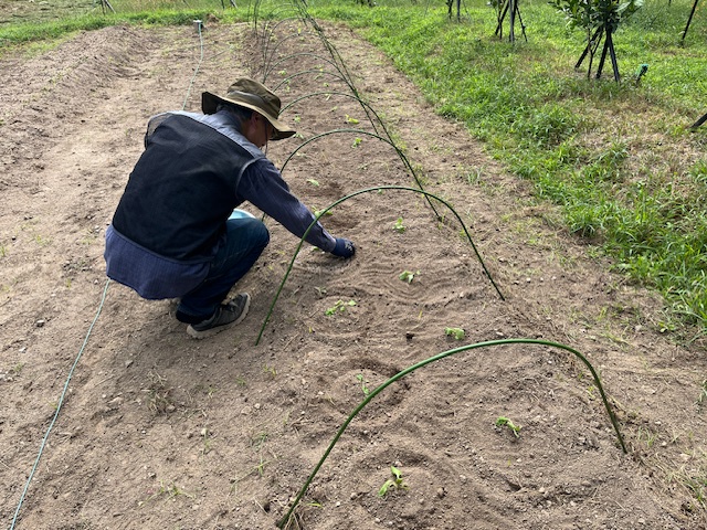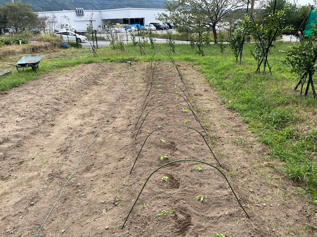 NPOの活動日で、果樹園の中に野菜を育てるコーナーを作っています、季節の野菜を体験できるように、白菜・大根を育てています今日は、元肥を入れ畝づくりをしたところに、朝から白菜を植え付けていきました。先輩方に聞き、白菜の間隔も植え付け時に均等になるよう線引きし間隔を取り植えていきました、最後は、トンネルを作り、虫よけ対策④完成です。しばらく毎日、水やりです!年末くらいに「白菜が出来たらと」思ってます。