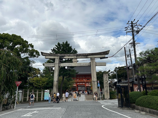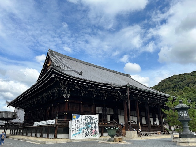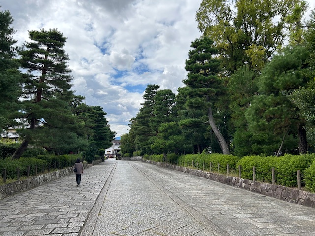 9月も終わりを迎えようとしてますが、まだまだ太陽の陽ざしがきつく秋雨前線の影響か暑い日が続いてます。毎月、京都へ来てますが、30度近い今頃の天候は、経験がないです。蒸し暑さも加わり歩くと汗が吹き出します。でも空の色、付近の景色は秋が深まってきています。八坂神社の前を通り大谷祖廟から丸山公園を抜け、知恩院へ向かう街道は、石畳の多いところです。大谷祖廟への行く街道の石畳はほんと広くて気持ちが落ち着きます。