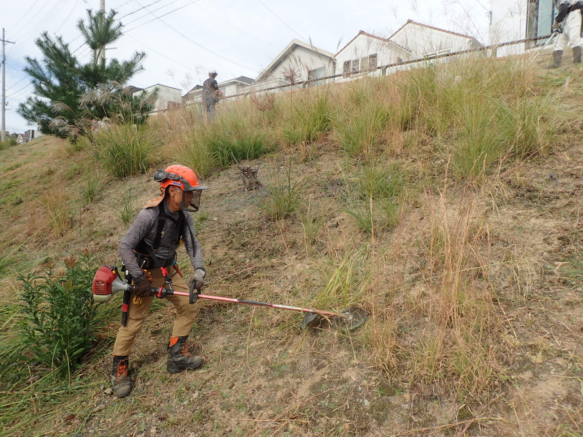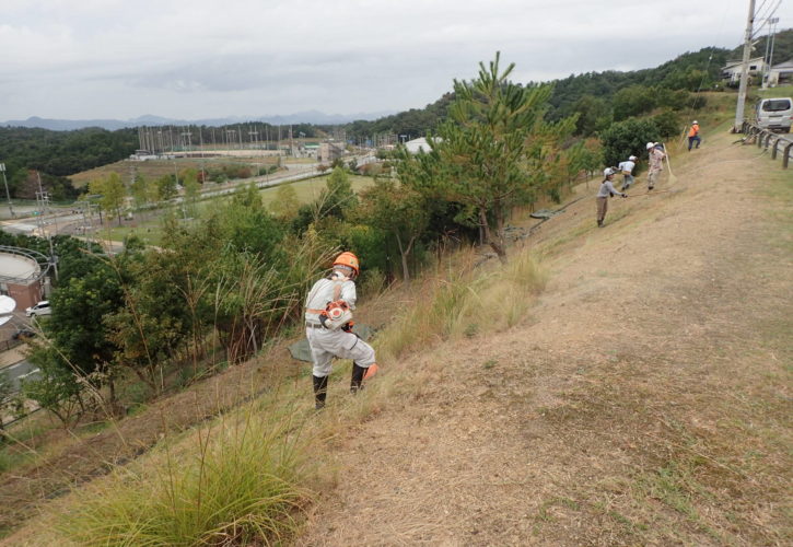 今日は、森町の道路沿いにある法面の除草活動を行いました。昨日から曇り空が続き天気予報は、午前中、曇りのち雨でした9時前に小雨がパラツトきましたが、何とか持ちそうな天気でしたので除草を行う事にしました。法面は、結構勾配もきついので、雨が降ると滑って危険なので困るなと思いながらでも何とか天気は持ち、昼からは、日差しが出るほどに、法面の一番上の部分が刈り終えることができました,もう10月も半ばというのに、ヘルメットをかぶると汗が出るほどの気温でした!