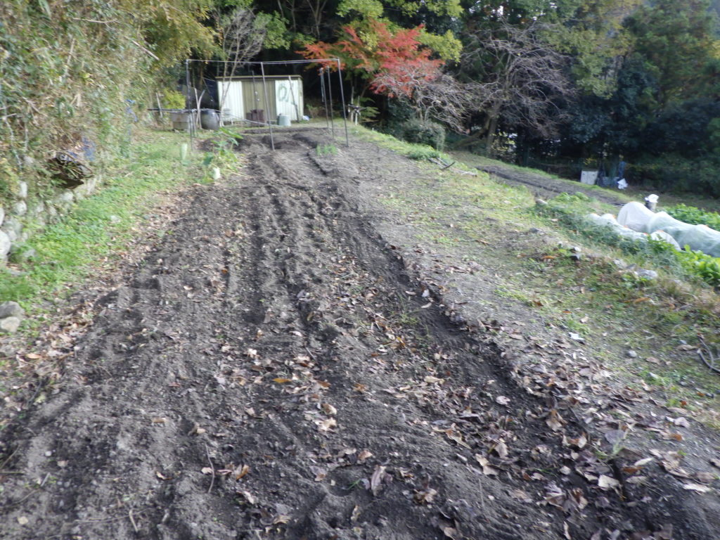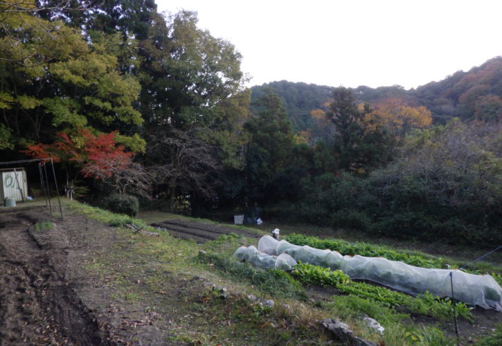 豊能の地区は、今までは、冬が厳しく12月になると氷点下近くまで下がってきます。今年も日中気温は、異常なまでに15度近くありますが、朝晩は、10度を下回ってきました。例年と違うのは、落ち葉が本格的に散るのが遅れていて、寒くなるのと同時に落ちるのかな?冬野菜は、今まで植えた野菜の継続で玉ねぎ・豆類の越冬が精一杯で、新しい野菜の植付けは、冬の温度では難しく、彼は堆肥などで土交ぜをします。まず土の空気の入れ替えから春まで、土を肥やします。さあ明日からが、菜園の再構築!
