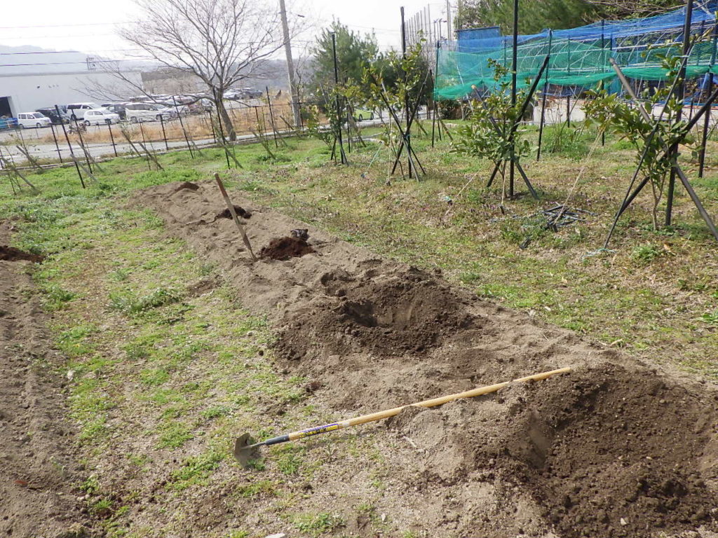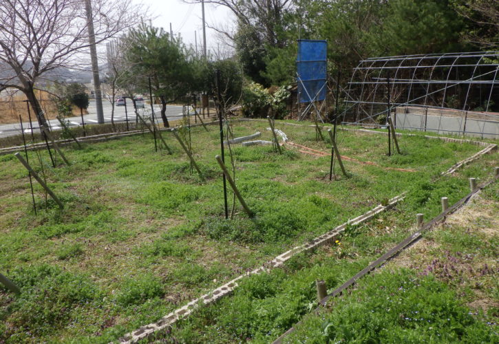 ほんとあたたかくなってきました。今日は果樹園に、ミカンの苗木を植えるため朝から土づくりを畑の畝を円形にして「苗木を植える場所を位置決めして」盛り土をそこに、ぎゅふん堆肥と油粕をまぜ土に混ぜていき苗木が植えれるよう円にしてを整地していきました。これは、もう手作業で土を掘り、寄せては交ぜそして円柱に盛り土していきます。「途中、土の中からミミズが出てきて降んずけないよう土に隠す」でもいい汗をかきました。来週まで土を寝かせ苗木が入るのを待ちます。