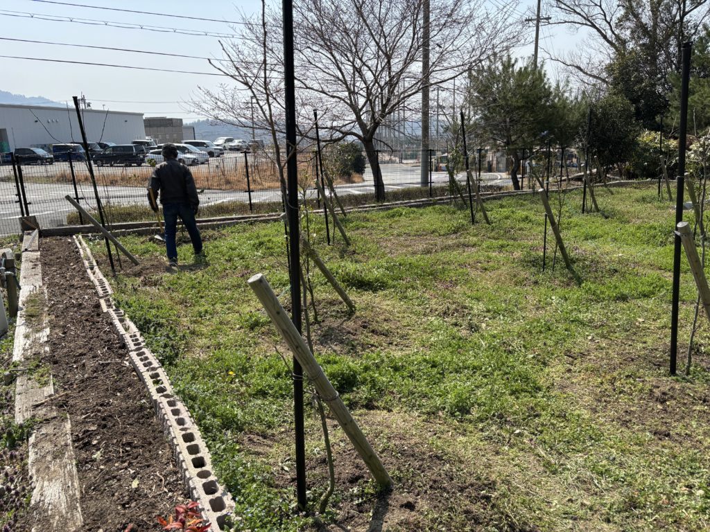 豊能も黄砂と花粉で見通しが悪い一日でした。外での活動日で「鼻と眼がムズムズ」眼はサングラスをして直接目に入らないようにガードしかしマスクは、この陽気でちょっと苦しいです!風もきつくほんと春独特の状況、果樹園も野草が、沢山育ち刈払い機で刈るのは、ちょっと早く野草の緑を残し春を感じれるように、木々の盛り土にアクセントつけ緑を残し整備!中々手間がかかりますが、良い感じです!
