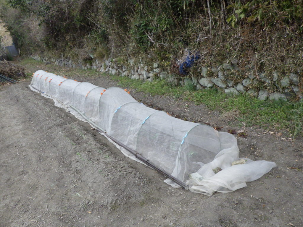 今日は、午前中しか天気が持たない予報、9時に「だんだん菜園に行きスタンバイ」朝から生暖かい空気があり、風が生ぬるい、もう、春過ぎての天気、一番上の段、日当たりのよいところに「キャベツ・レタスの苗を植えます」土づくりは、先週までにすましているので植えるだけ、10個づつ植えて、化成肥料を撒きトンネルをつくり寒冷紗をかけて完了丁度お昼、そして雨が降ってきた何とか終わりホッと一息!