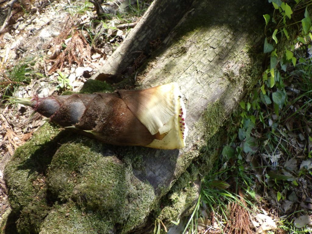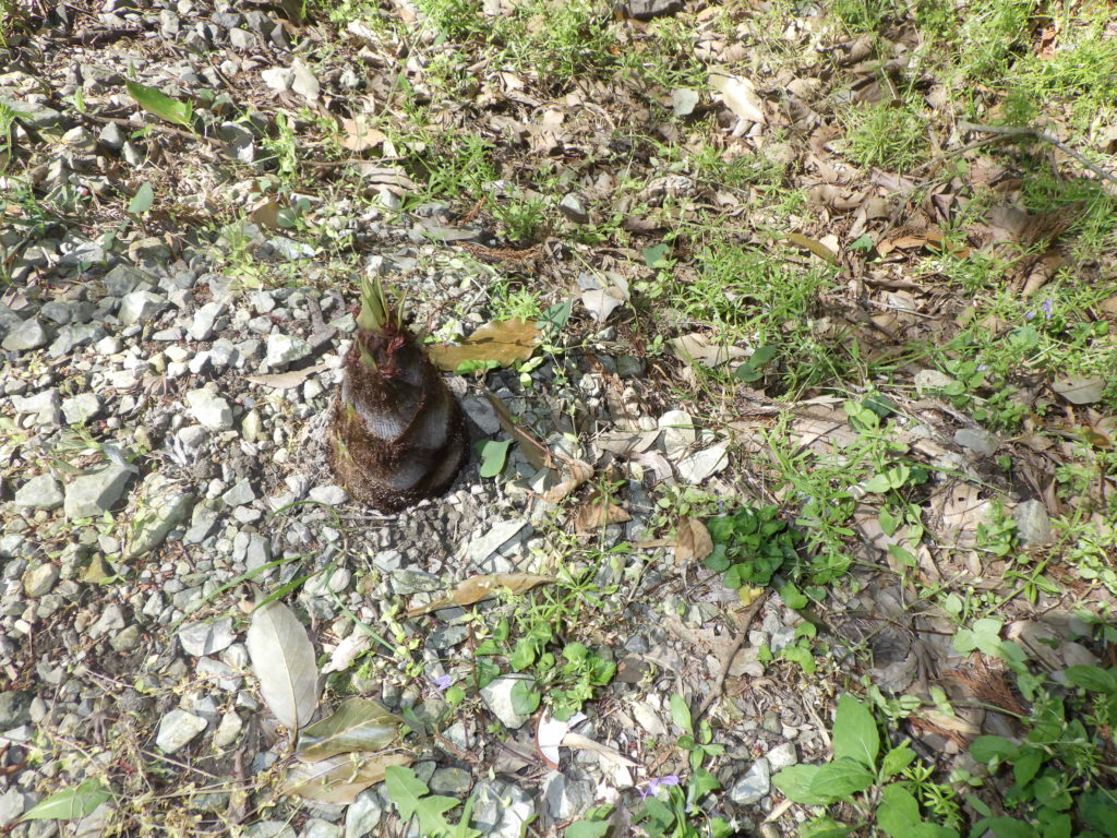 「だんだん菜園も春から初夏のモード」菜園は、土は、冬越しをしてその間休眠中なので、とても草木にとっては、栄養満点の土地です。眠ってた生き物が一斉に芽を出し元気よく育って来てます。夏野菜を植えようとだんだん菜園の最下部へ移動しようと降りていくとタケノコの芽が見えたので「鍬を取り土を掘り起こすとこんな立派なタケノコが取れた」