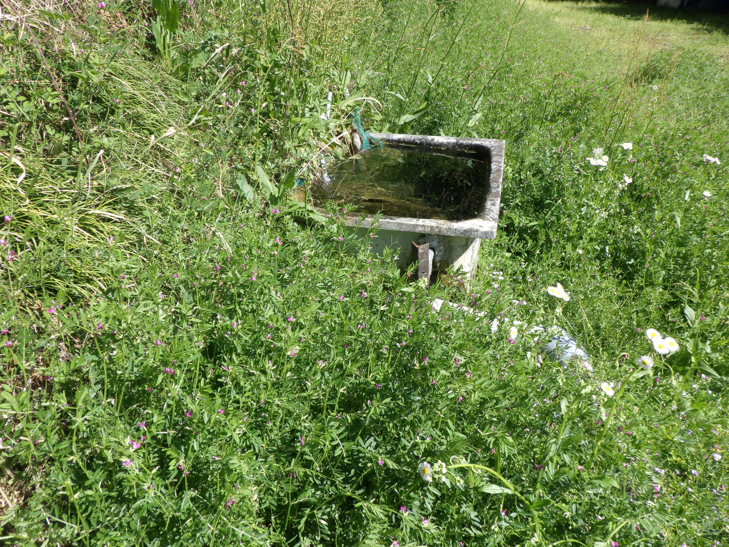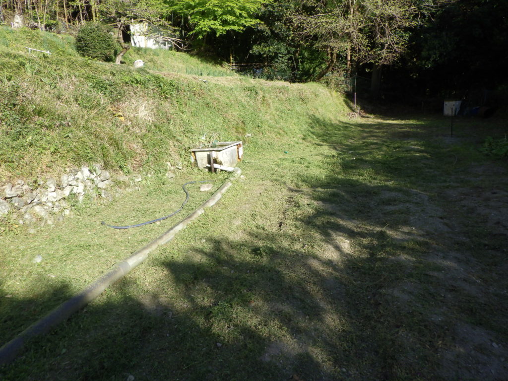 もう草がいっぱい、まず草刈りから刈払い機で草の刈込「長靴が埋まるほどの映えよう」草の勢いは凄いです。土の表面まで刈り込み土を出し刈り取る。