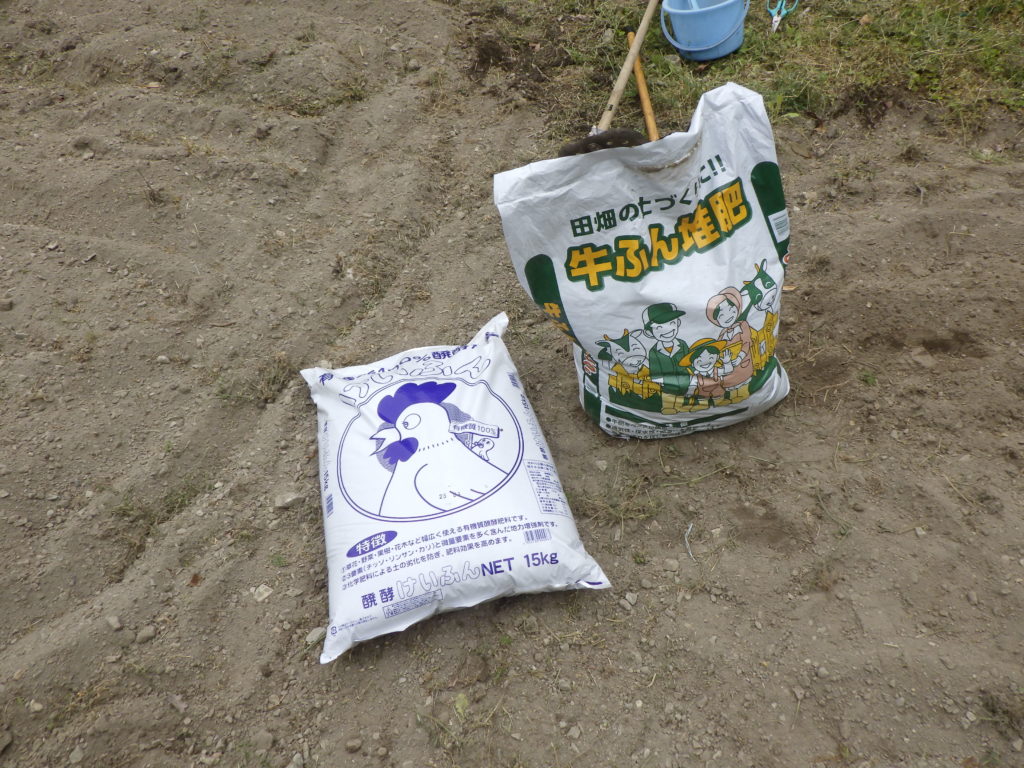 - 牛糞と鶏糞を土の中でブレンド