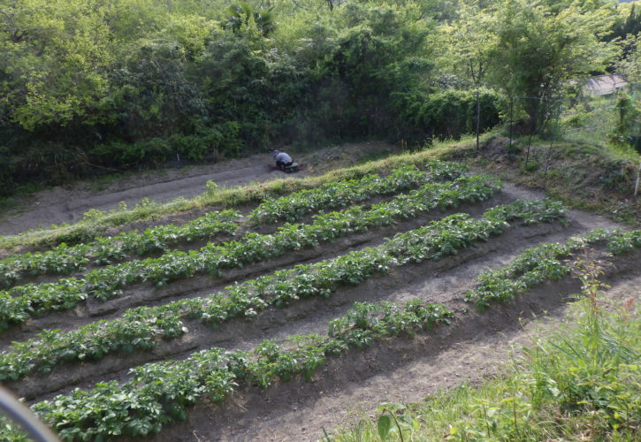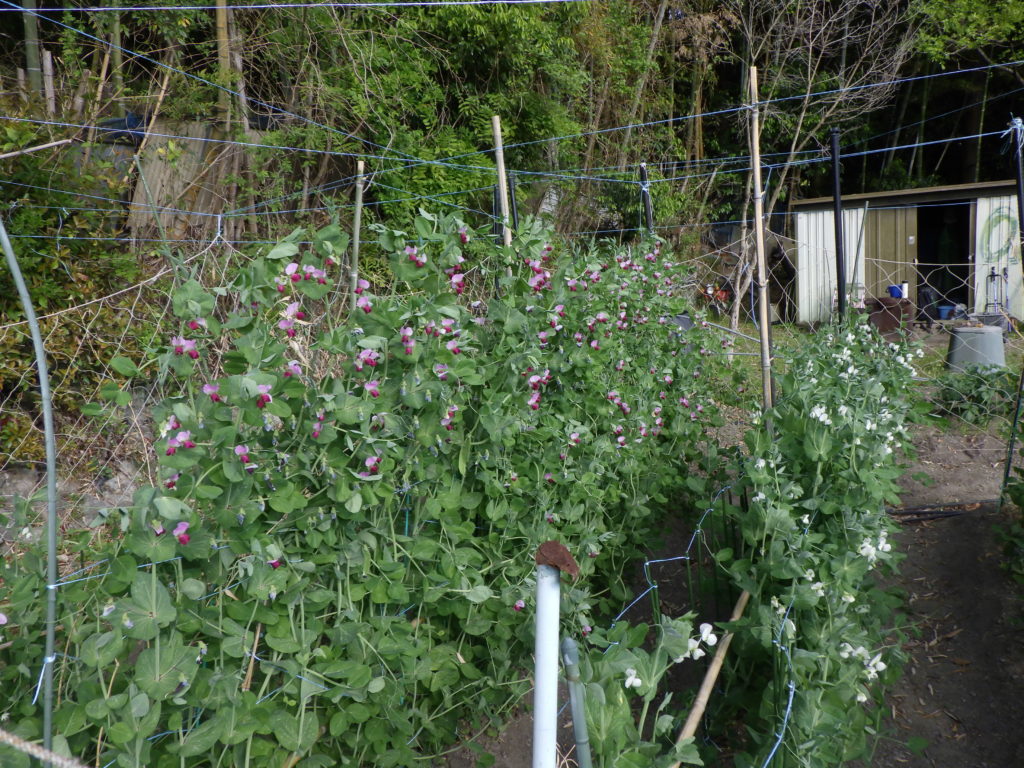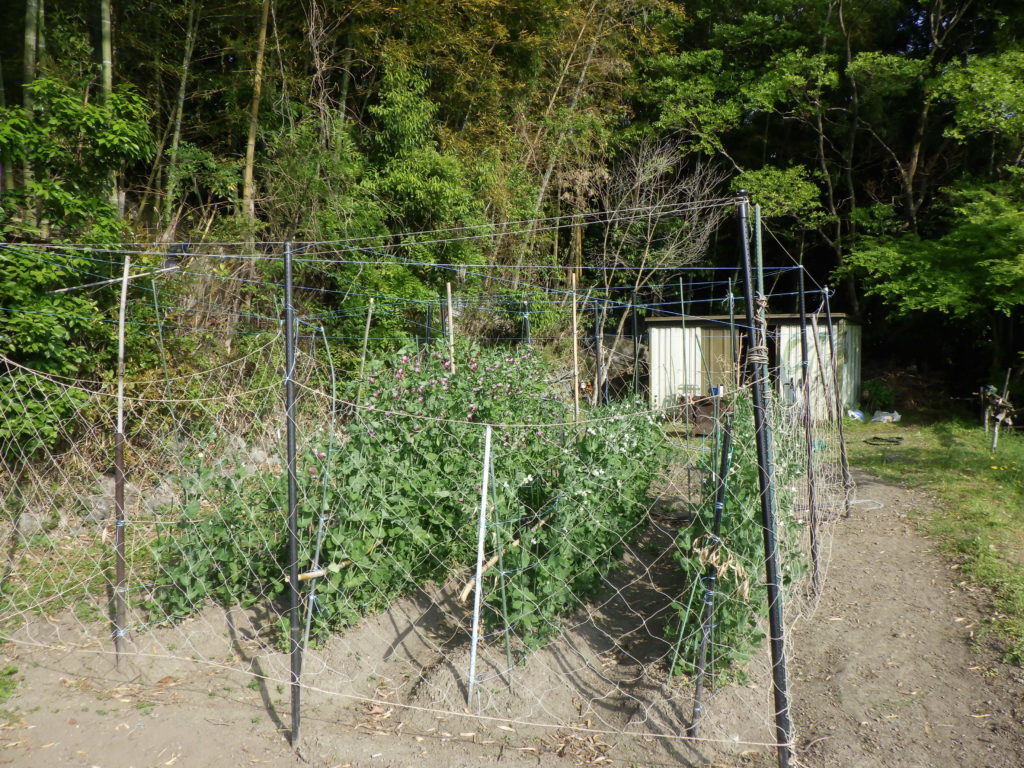 今日も25度近くに上がりもう夏日です。先週、ジャガイモの芽カキをして追肥しておきました。雨もあり、元気に育っています。ここだんだん菜園は、動物や野鳥が沢山いて獣害を気を付けないと早速、ムクドリなどが、サンド豆を狙いに来てます、上段部に花が咲き実がなり始めました、早速、侵入者、野鳥が新しい実をつついて食べてます。今日は、ネットを張りや蝶から豆を守ります「今年は見通しも良く狙われるかと思っていたらやっぱり!」全周ネット囲い!