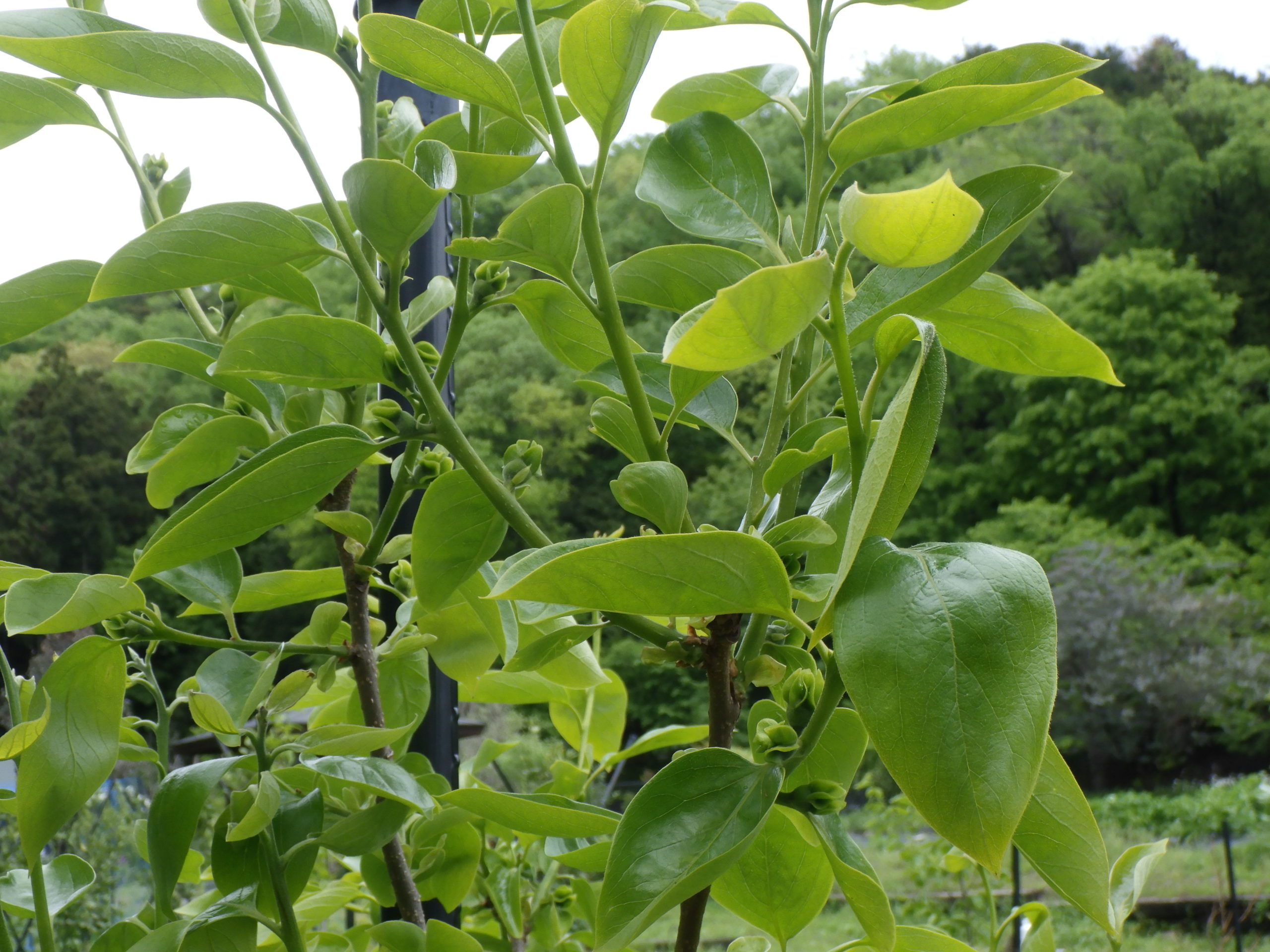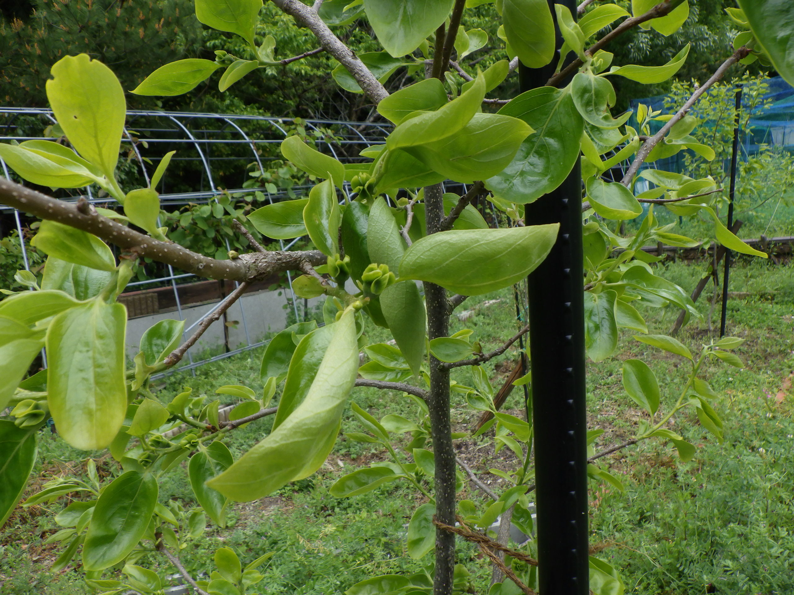 今日は、朝から雨が降り、夕方まで降ったり止んだりの少し肌寒い一日でした。箕面森町の果樹園の草木にとっては、いい具合だろうな「柿の木も植えて3年になる」今年は、幹から小枝が沢山出てきてはも元気そして、初めて実がなりそう 10本ある柿の木が、みんな小さな実をつけている。「桃栗3年柿8年」はどの時点を言うのかな!