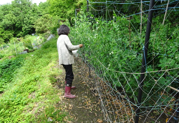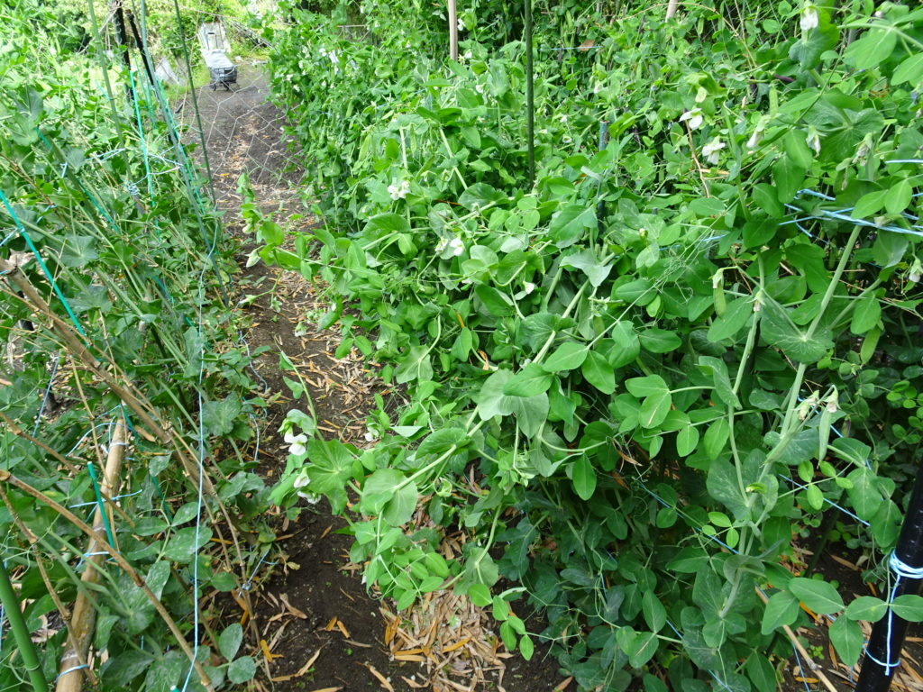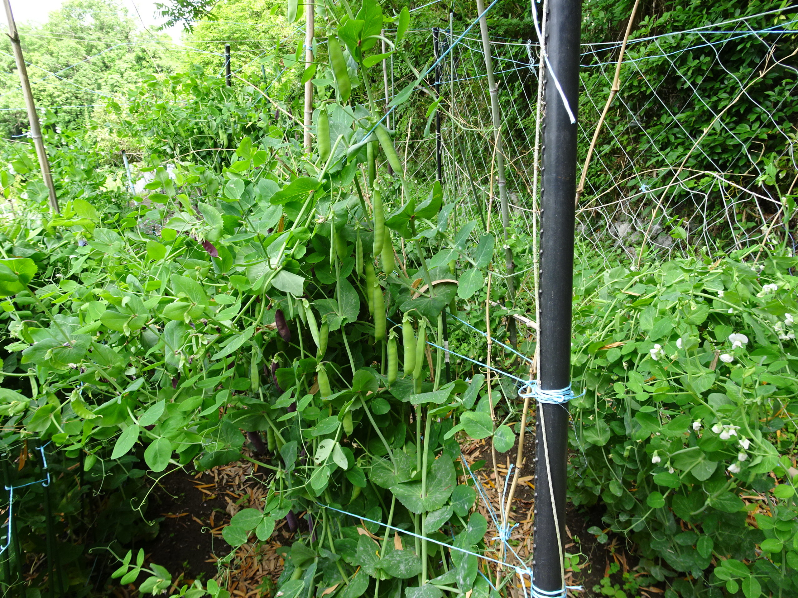 だんだん菜園は、今年は、順調に野菜が育ってます。豆類が育ちすぎで、支えが間に合わない状態で後追いになって追いかけてひもをかけてます。だんだん菜園の一番上に植えたので、日当たりも良く伸びるのが凄く早いです。周りのネットなどを張り、鳥の侵入は防げたのですが、雨がここ暫く時々降るので、成長を自然の力で、ぐんぐん伸びてます。今日も見に行くと外周のネツトに垂れ下がるぐらいです。「スナップエンドウ・あか豆が収穫して」重さを和らげてやりました、今日から豆の料理美味しく食べます。