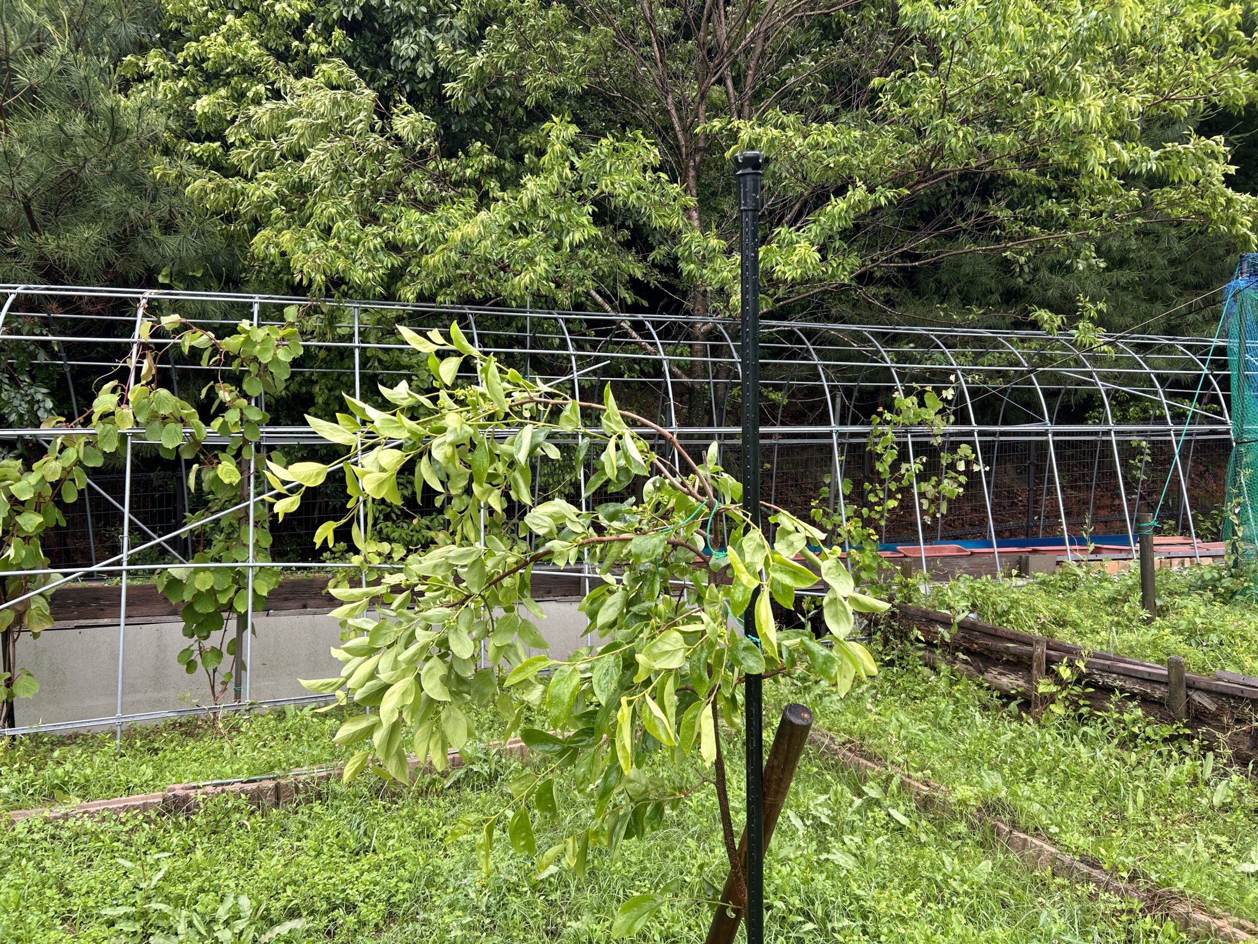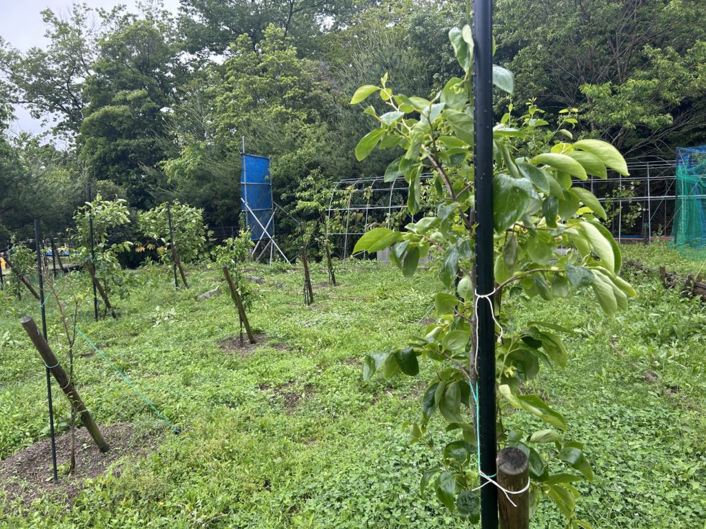 今朝は、一目散に果樹園を見に、あの強風で「かなりの数が倒れたかと心配」でも何とか持ちこたえていた。昨日、雨の中、支柱に括り付けたのが効いたか、それでも、かなりの紐が外れていたが、ふらふら揺られながらも必死で柿の木も頑張ったのかな!まだ若い木なので芯の枝より、横の葉や実の方が重たくなり支えるのがギリギリかな?朝から枝を支えると共に、支柱を増強を始めました。