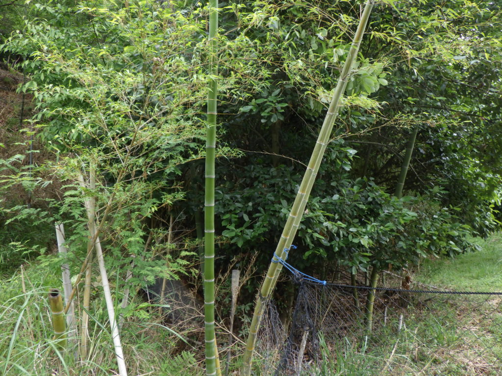 今年は、冬からの寒暖差の急激な変化は、収まるところを知りません、「豊能の里山の木々、野草にとっては好影響かな」新緑の木々の葉、野草の緑、自然環境は良い方向です、その分手入れは小まめにやらないと「虫や蛇、そしてもぐらなど」が、暴れ放題です、今日は、この気候変動で雨風がきつく例年より、厚めの野菜の養生が入りそうです「支柱を張る準備」まず竹林の除草から!