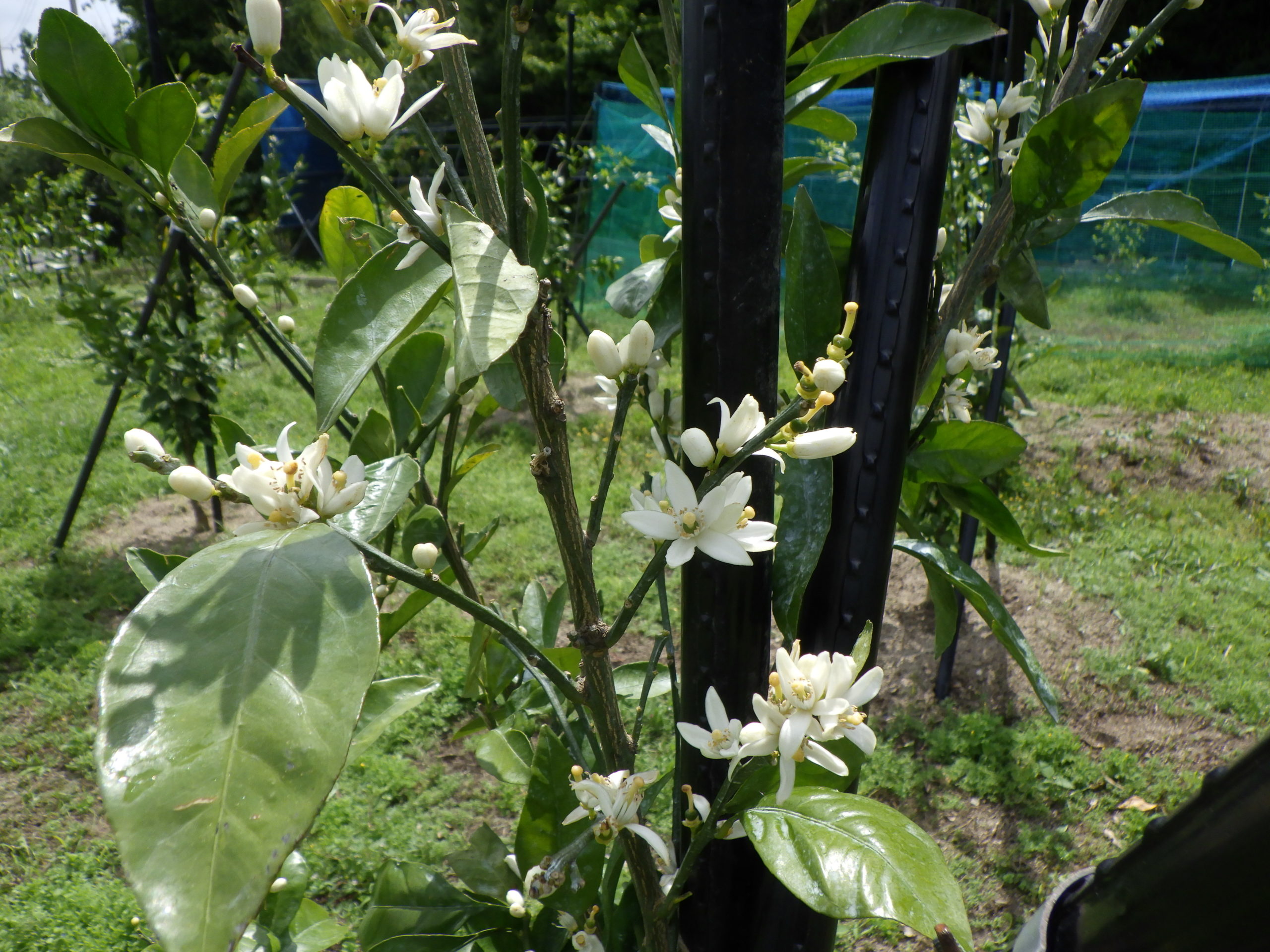 豊能の里山果樹園は、箕面森町の高台に位置しており、天候が悪くなると強風が吹き荒れます、支柱を立て倒れないようにとしてますが、中々、いう事を聞いてくれません、今日、見て回ると「ミカンの花が白い花を咲かせ」咲いていいにおいを発していました、チョウチョが飛び交い実がなるのが楽しみ!