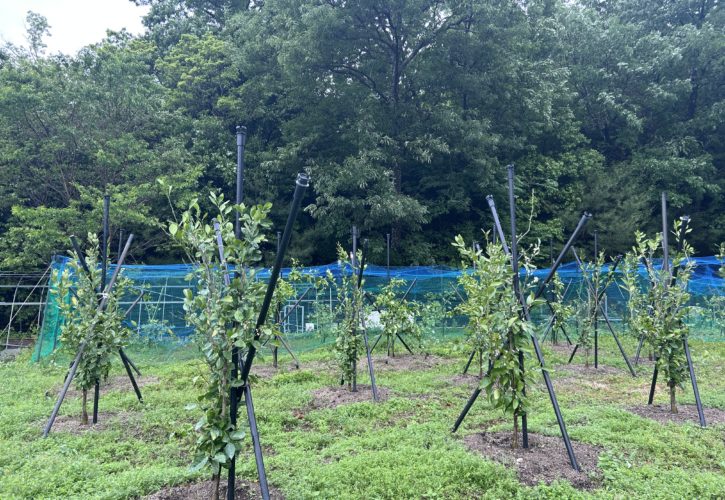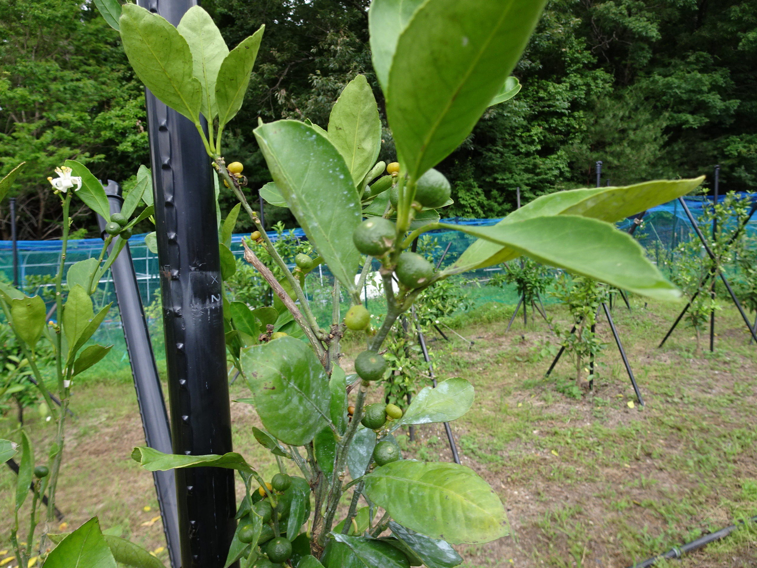 昨日の夜更けから早朝にかけ、激しい雨に見舞われ、果樹園も「ぐちょぐちょ!」だ、長靴でないと歩けないほどです、チョウ除けに、酢酸酢を掛けておいたのがすっかりとれている、チョウが、ミカンの葉っぱが、幼虫を生育するのに良いらしい、薬を掛けるのもためらうので、この間から酢酸酢を掛け、チョウ除けにしている、来週から夏並みの天気に戻る予測なので、根気よくかけて少しでも被害を少なくする「小さなミカンの実が」育ってきた。
