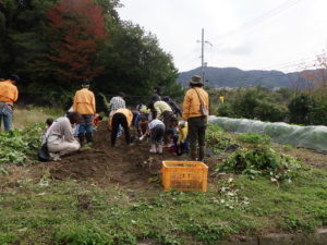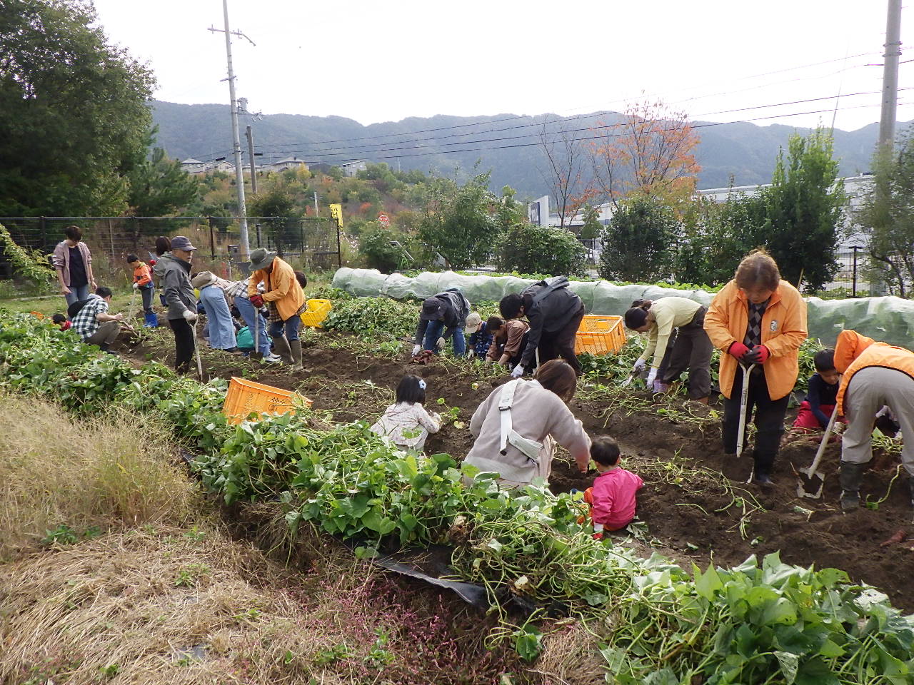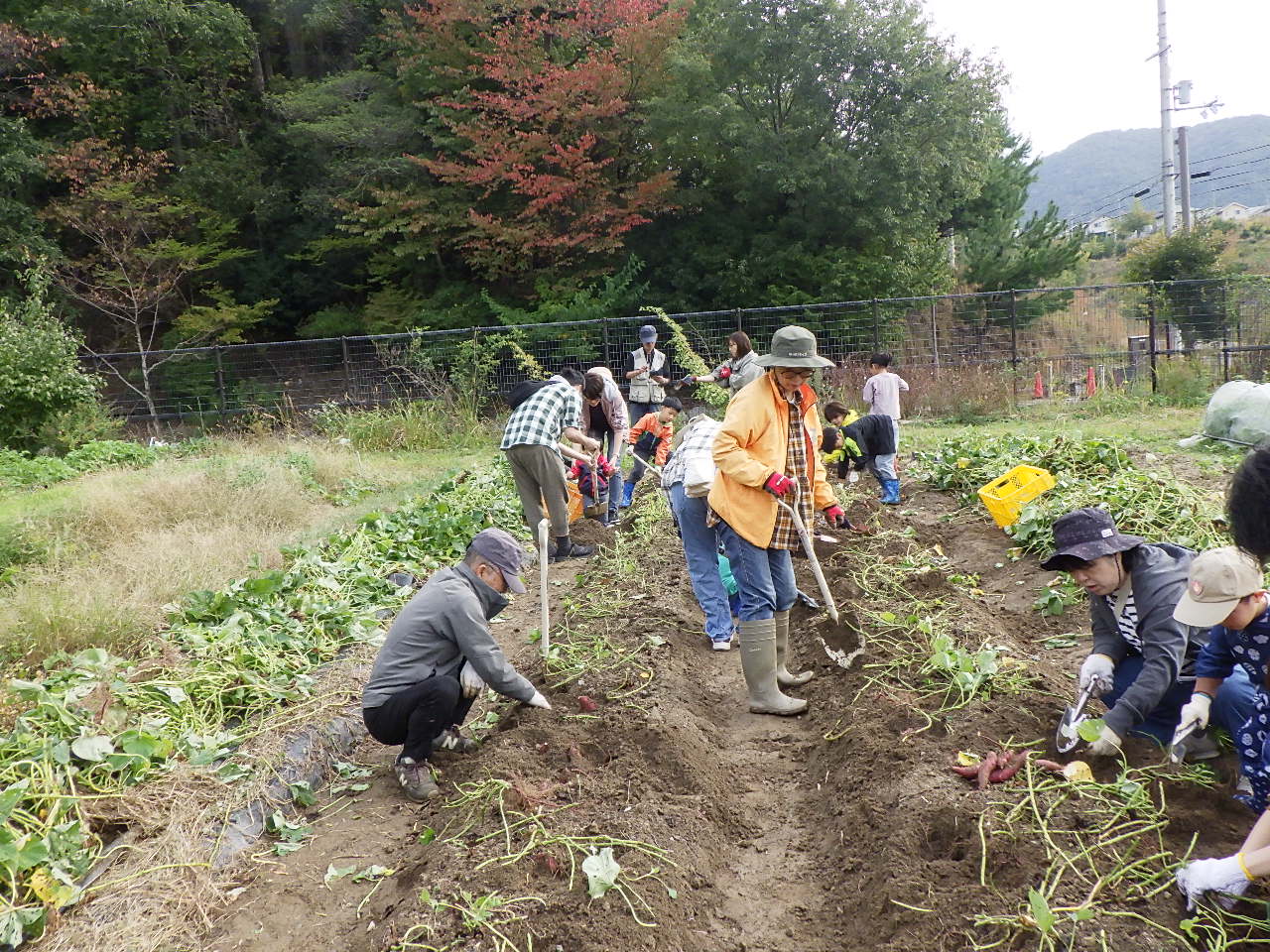 今日は、NPOの芋ほりを行いました。11月に入り豊能も寒くなってきました。紅葉が進む菜園で、今年、最後の農業体験です、畝のサツマイモの蔓を上げ、土が見えるようにして、皆でお芋さんを掘りました「今年のサツマイモは、暑さのせいか、例年より小ぶりかな」お家で料理するのには、良い大きさかも!