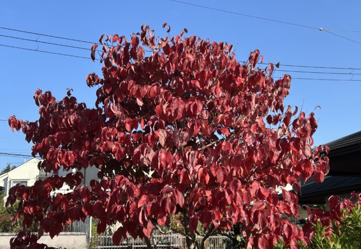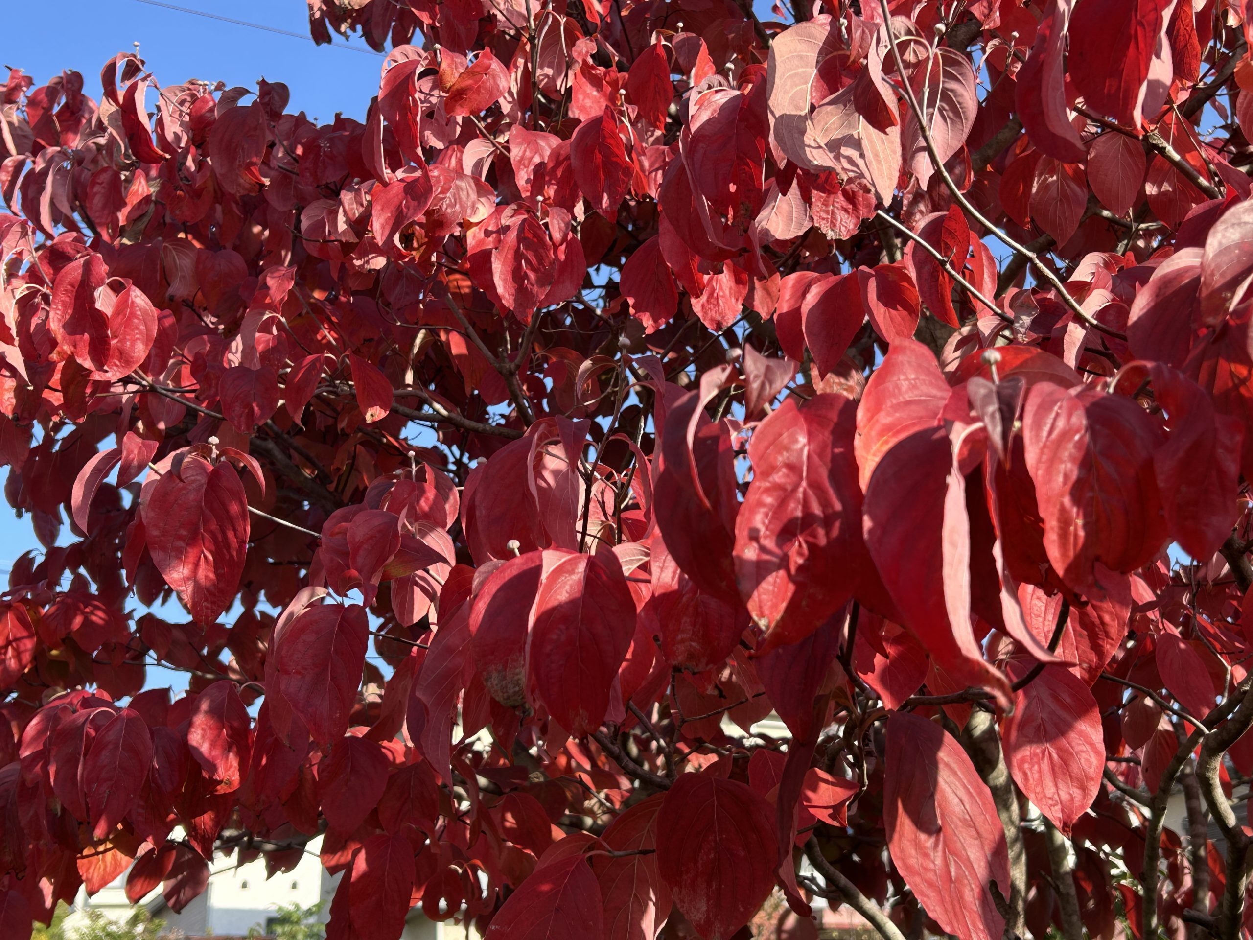 秋が短いせいか、落葉樹の葉の紅葉が鮮やかに変化している、自宅に植えているハナミズキの葉の色が、鮮やかな深紅だ、もう少し早く築くとよかったけど!例年は、こんなに紅葉しない急に寒くなったので、葉の色が深みが増したのかな!