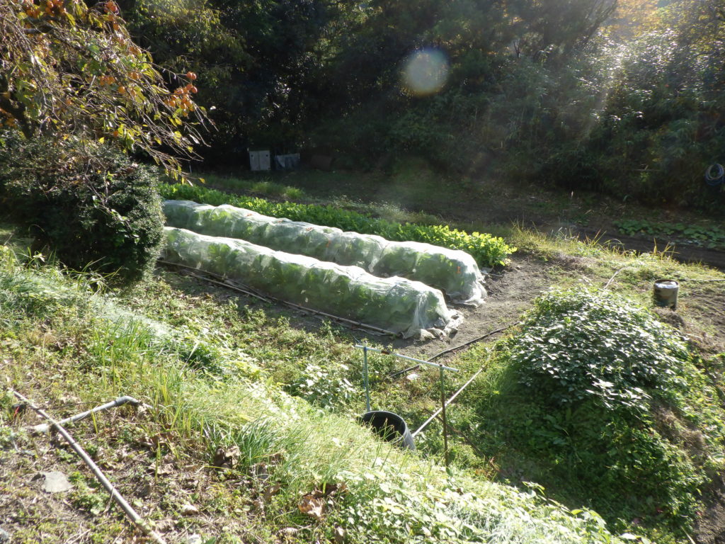 豊能では、朝の気温が連続して、10度を下回り寝る時は、電気毛布を入れだしました。夏は太陽の輝きが、たまらなく暑く何とか日陰を探していましたが、この時期になると日差しが恋しくて日の当たる中を心地よい感じで日差しを求めています。冬野菜の葉物が元気に育ち水菜などが育ってきています、今日は、初めて収穫し、みそ汁の具にしました。
