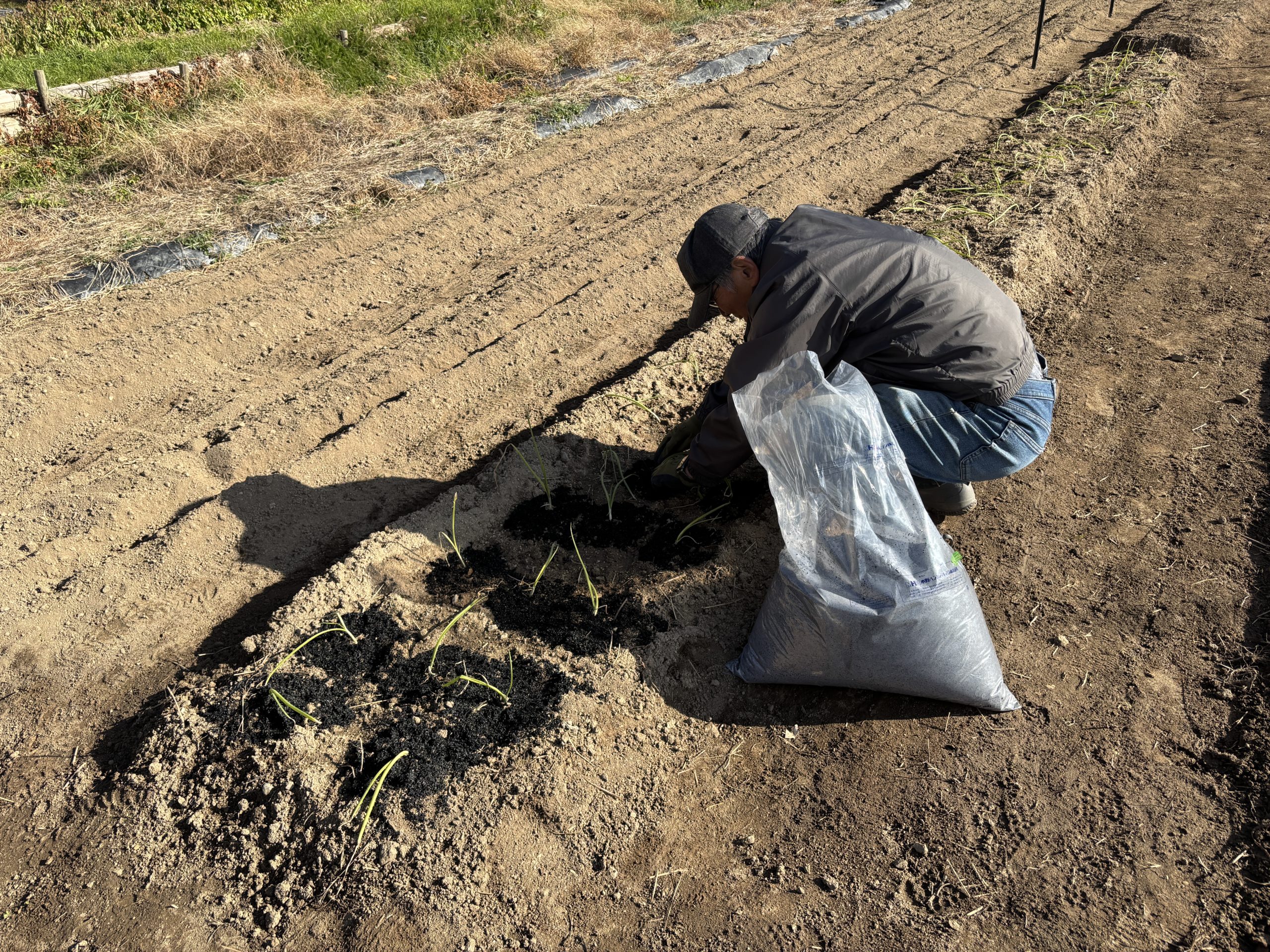 今日は、箕面森町の菜園で「玉ねぎの冬越しの準備」をしました。ボチボチ寒くなってきて、玉ねぎの苗を植え畑の畝に定着してきました、今日は、その上に「もみ殻クンタンを根元に入れて行きます、燻クンタンは、酸性土壌をかいりょうしてくれてそしてアブラムシなどの虫よけ効果もあります、又、保温効果もありこの状態で冬越しをします。