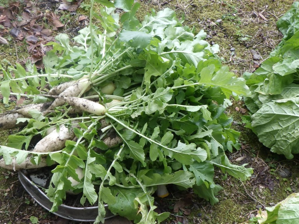 今日は、朝から予報通りの寒さ、お昼になっても5度ぐらいの寒さ、巳ずれの混じる天気でした、そんな中、だんだん菜園に行き、正月用の冬野菜の収穫に出かけました「大根・白菜・ほうれん草、水菜など」大根は小さめの雑煮用の大根もとりました、ここ暫くの雨などで良く育ってる!