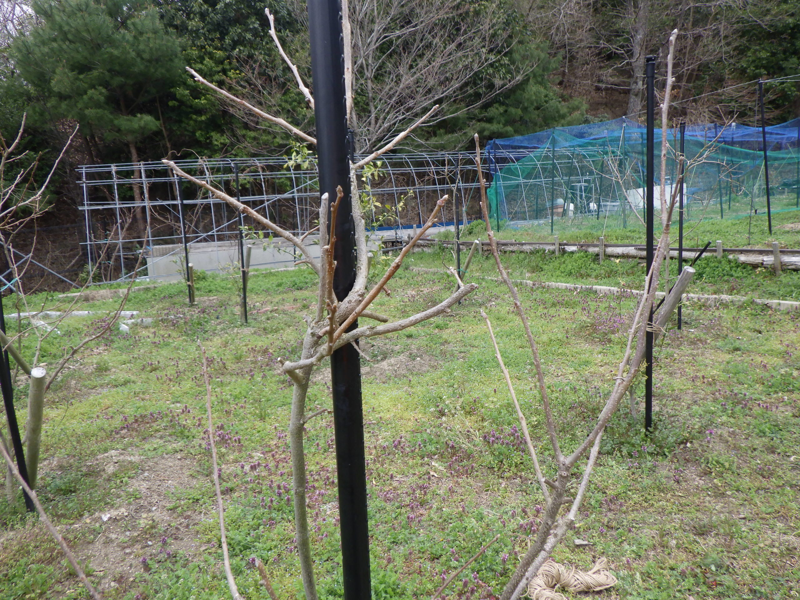 箕面森町の里山管理小屋の前の菜園に、3年前ぐらいから「里山の果樹園」を作っています、ようやく「柿・柚子・ミカンなど」の木が少しずつ育ってきました、植え付けた時に、支えとして支柱を立て木々が折れたり傷つかないよう立てた支柱が木の成長と共に邪魔になる部分は、支柱を立替て伸びるよう入れ替えましたが、なんと上の部分は、反対に木が迂回するよううまく曲がり支柱に沿って伸びてます!