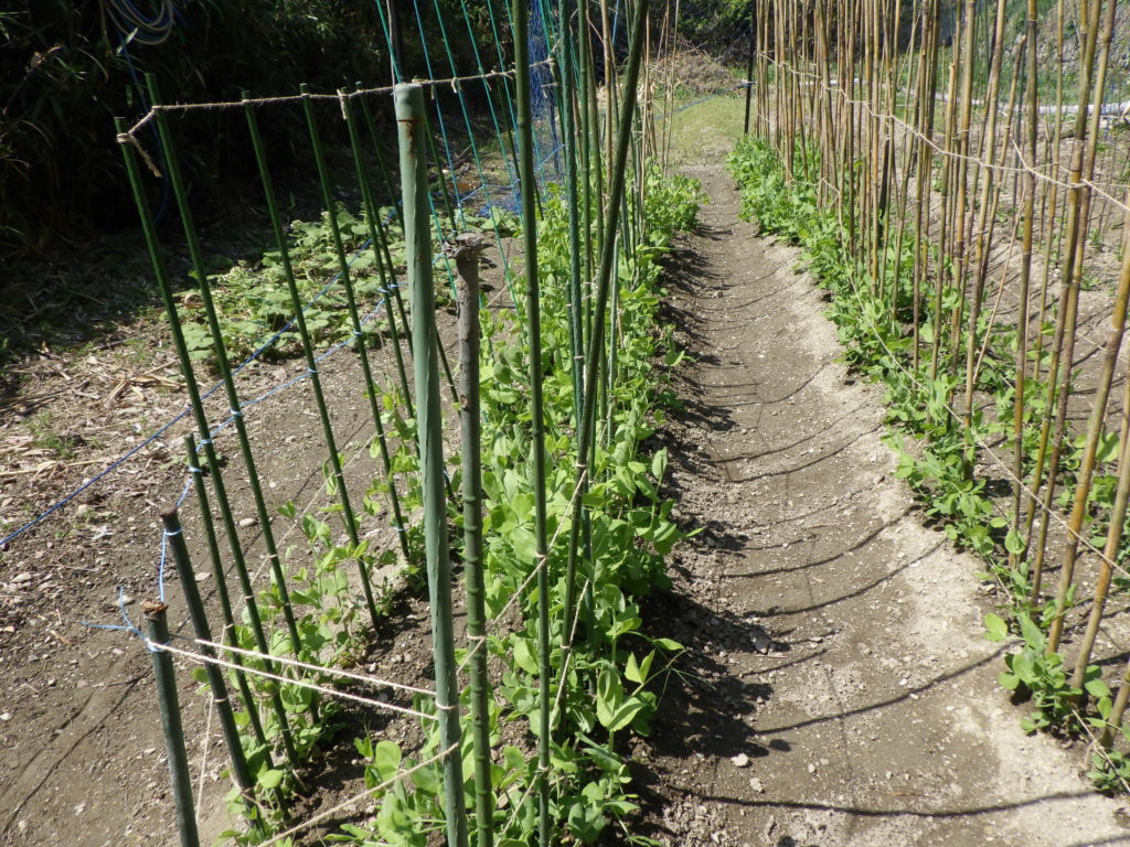 今年も野菜が育ってきました。だんだん菜園も朝晩は、まだ寒いですが、日中は、15度以上になってきて植物が育ちやすい環境になっています。そして同じように草花も育っているので、来週ぐらいには、今年最初の除草を始めないとそして「玉ねぎなどに2度目の追肥」を入れる豆も後から植えた豆の種も発芽し全体の支柱を立て補強しました!