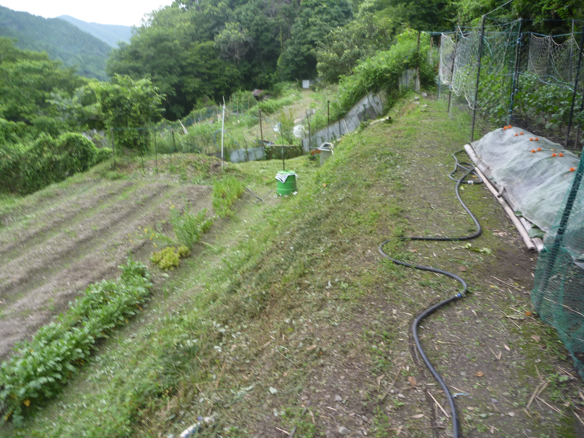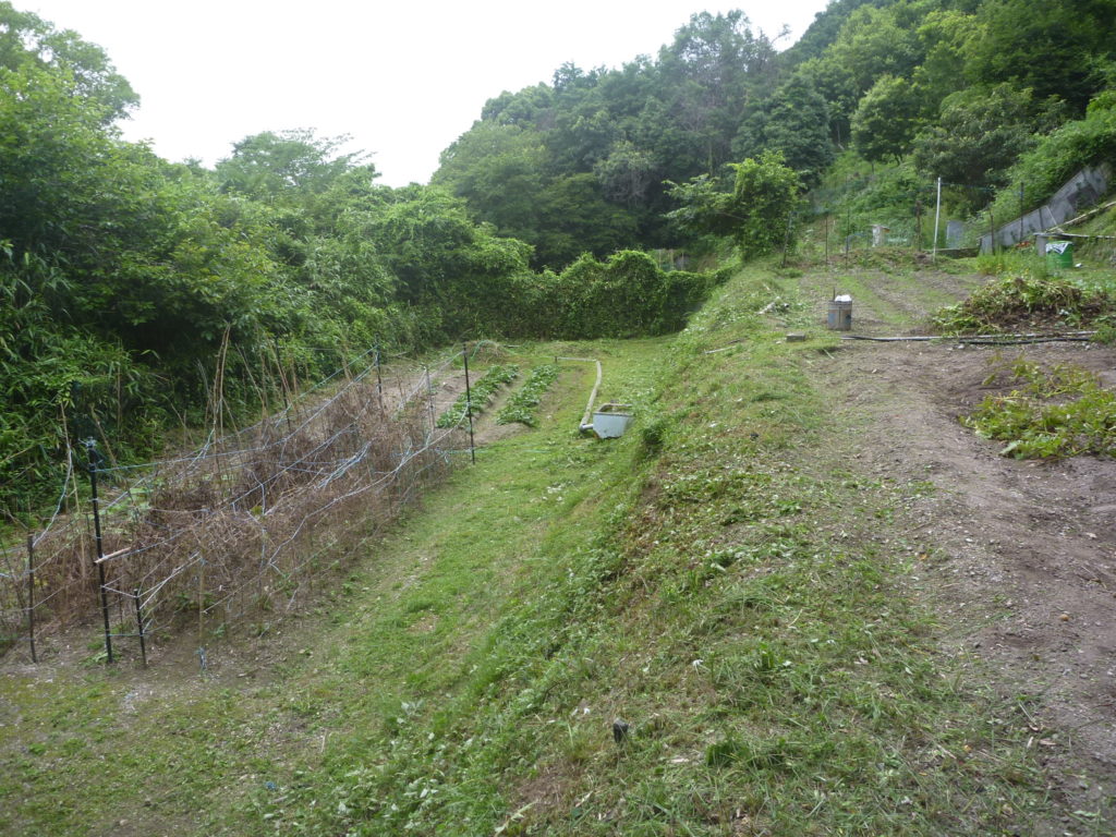 今年は、早くから暑い日が続き雑草の伸びがすごい、肥料も何も入れていないが、畑の中では一番成長が早く元気だもうほっておくと草畑になる春から3回目の草刈かな3段ある畑の法面とあぜ道の草刈に2日を掛けて草刈、今日ようやく完了、梅雨の暑い日に一番スカッとする瞬間だ!一番上の段で椅子を取り出ししばし休憩!