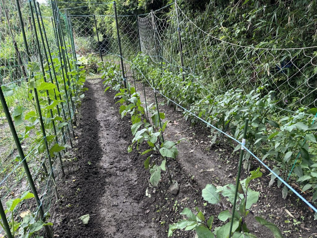 晴れの日が続き野菜の成長を心配していましたが先週から梅雨に入り、雨が降ったり止んだりの天気とこの暑さが野菜の成長を一気にいい影響を与えました。しかし例年より蒸し暑さは、半端なものでなく虫たちも一緒に成長し育った野菜の葉を食べん困りものです。今年は草刈りに追われる日々が続きそうです。